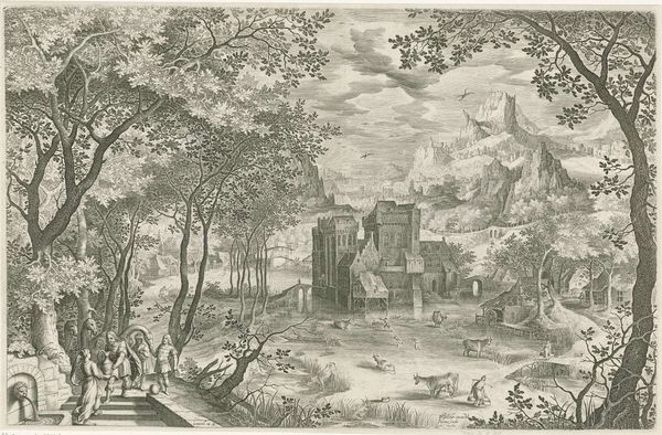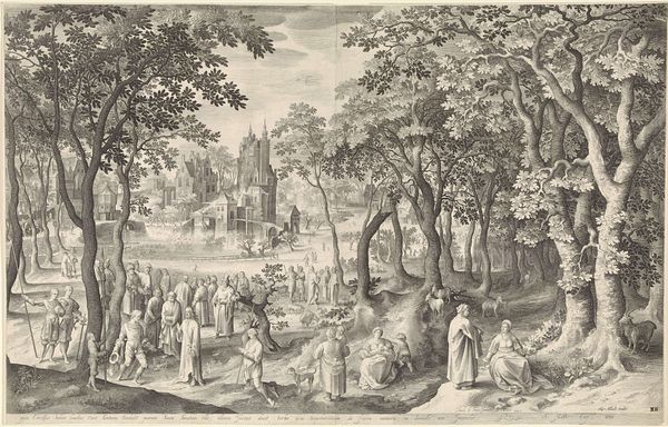 Nicolaes de Bruyn created "Feest in een bos" with engraving techniques. De Bruyn lived during the Dutch Golden Age, a period of immense cultural and economic growth for the Netherlands. The artwork depicts a festive gathering in a forest, with people eating, drinking, and making music, while in the background, a castle rises up from the water. As you observe the details of the scene, consider the interplay between nature and culture. What could the forest represent in the context of 17th-century Dutch society? Is it a space of freedom and leisure, or does it reflect deeper social and ecological dynamics? How does this contrast with the strict architectural forms of the buildings in the background? The emotional quality of this artwork is one of celebration and abundance. As you explore the image, reflect on how the piece captures the spirit and tensions of its time.