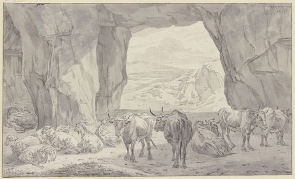 Cornelis Visscher created this print of Washerwomen and a Shepherd by the Water in the mid-17th century using etching. Here, the use of light and shadow creates a sense of depth, drawing our eye from the foreground figures to the distant shepherdess. The composition is structured around a series of interconnected curves. See how the bodies of the washerwomen mirror the shapes of the animals, creating a visual echo that links human activity with the natural world. This interplay of light and form is not merely decorative. It serves to destabilize traditional notions of pastoral life. The scene isn't idealized. Instead, Visscher seems to emphasize the physicality and labor inherent in daily existence, contrasting the labouring women with the watchful shepherdess, thus creating a dialogue on labor and the female form. Note how the textures – from the rough bark of the trees to the soft fleece of the sheep – are rendered with meticulous detail. This attention to materiality transforms the print into a profound meditation on the relationship between humanity and nature, questioning our understanding of value and representation.