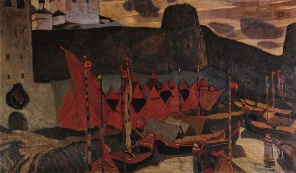 Albrecht Altdorfer created this section of "The Battle of Issus" with oil on wood panel, presenting a dizzying, panoramic view of the ancient clash. Here, a dense tapestry of pointed tents and buildings form a horizon-to-horizon backdrop. The structures, rendered with striking verticality, jut skyward; the city itself is a jumble of shapes and colors, a maze of architectural forms. Look at how Altdorfer destabilizes traditional perspective, creating a flattened, almost abstract composition. The artist orchestrates color and form to evoke a sense of overwhelming chaos and grandeur, a semiotic system of military might. This portrayal transcends mere historical record. Instead, it challenges fixed notions of space and representation, inviting an ongoing interpretation of power and spectacle. Notice the almost obsessive attention to detail. It's not just about aesthetic appeal; it's a grand historical, cultural, and philosophical statement.