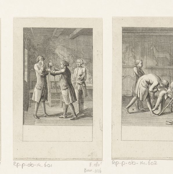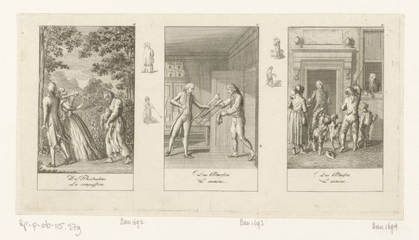 This delicate engraving, "Complimenteuze dwaasheid", was made by Daniel Chodowiecki. Note the exaggerated bow, a gesture laden with social meaning. In the 18th century, such bows were not mere greetings; they were performances of status, echoing the rigid hierarchies of the court. Observe how this motif of exaggerated deference appears across cultures. Think of ancient Egyptian depictions of subjects bowing before the Pharaoh, or medieval illustrations of knights kneeling before their lords. Each bow, though seemingly similar, carries the weight of its own time and place. Consider the psychological dimension: the act of bowing can be seen as a symbolic submission. It represents a complex interplay of power, respect, and perhaps even hidden desires. This dance of gestures has recurred throughout history, evolving in form but remaining constant in its underlying expression of human relationships, a perpetual return.