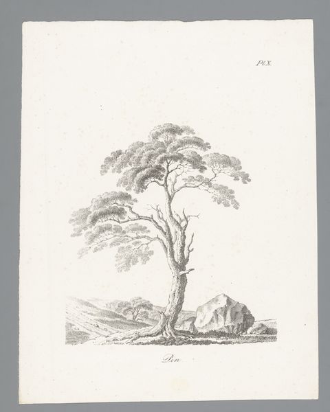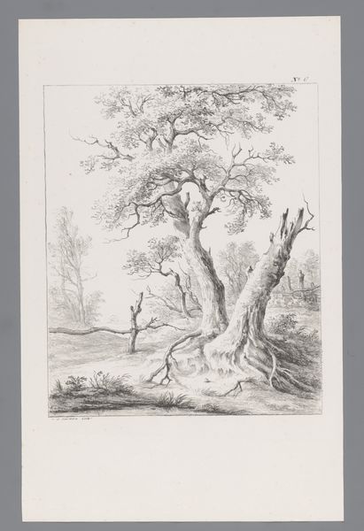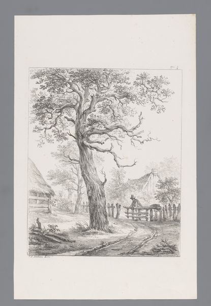 Curator: Let’s turn our attention to a compelling pencil drawing from the period of 1809 to 1840 titled, "Boom met daarachter een laag hek," or "Tree with a Low Fence Behind it," by Carel Lodewijk Hansen, now housed here at the Rijksmuseum. Editor: Immediately, I'm struck by the solitude of the scene. The starkness of the pencil against the paper and the skeletal branches reaching into the sky create a somber, almost desolate atmosphere. Curator: The artist's careful use of line certainly emphasizes the tree’s silhouette. It becomes an almost anthropomorphic figure; that bending posture suggests both resilience and vulnerability. Tree as symbol has so much cultural memory attached to it! Editor: Absolutely. Given the Romantic period in which Hansen worked, I wonder how much this depiction is about more than just observing nature. The fence, for example, becomes symbolic. Is it dividing or protecting? Implying ownership or exclusion? Who is shut out, and from what? Curator: That barrier presents multiple readings, as a liminal space—suggesting a threshold to somewhere, or someone. Consider how lines around the tree are dark and deeply defined and how this contributes to it emerging almost defiantly out of the ground. I see it echoing classical Romantic themes around nature as a redemptive force. Editor: And yet, the subdued tone of the piece pushes me away from easy interpretations of nature’s inherent goodness. I can’t ignore the possible class implications here either, land ownership being far from equitably distributed at this time. A seemingly benign scene such as this also becomes coded as a certain power relationship. Curator: The work holds a tension, visually and conceptually. Even Hansen's dedication to a 'realistic' landscape belies the loaded meaning behind it. His decision to use only pencil to convey so much says to me something of the era’s desire to confront and distill human experience to its elemental forms. Editor: Agreed. It invites us to reflect on the different layers within seemingly simple imagery. There's much to uncover in how social, political, and personal contexts converge.