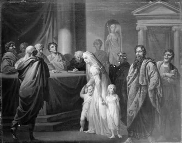 Editor: C.A. Lorentzen's "Melampe, V. akt, 9. scene," created in 1815, is an oil on canvas history painting, though in this black and white image the texture of the fabric of clothing stands out more than the subjects' emotions. What can we unpack in terms of the artist's choice of materials, and how do they speak to its social context? Curator: Focusing on the material production, consider the canvas itself. Canvas, even then, wasn't merely a neutral ground; it represented a certain level of economic access and, in its scale, ambition. And who would buy such art and what impact would such choices have had on academic and romantic painters of the time? Editor: So, you are thinking of the socio-economics of purchasing the raw materials? Was canvas particularly expensive or hard to get at this point? Curator: Exactly. The quality and preparation of the canvas reveal much about the artist's intent and the painting's intended audience. Consider how labor intensive it was to stretch, prime and prepare a canvas of that size. It's a statement of commitment, both by the artist and, prospectively, by the patron. Furthermore, what pigments did Lorentzen use? Were they locally sourced or imported? Editor: Imported pigments likely meant greater expense, signifying wealth, prestige, or access to a broader trade network. What about the narrative aspect? Curator: Ah, yes! It's also essential to delve into how this piece participates in a specific visual language meant for educated elites and also served the interest of local suppliers versus external forces in the distribution of materials. How would a contemporary audience receive such symbolism and technical facility with imported techniques versus traditional artisanal works? Editor: Fascinating. I hadn't considered the material choices as indicators of something much broader economic statement. This work engages in a network of value and access that's easily overlooked.