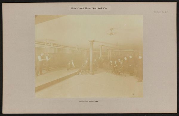 Editor: Here we have a sepia-toned photograph titled "Industrial Problems, Welfare Work…" taken by the Byron Company. It depicts a recreation room for employees of the Brooklyn Rapid Transit Company. The linear perspective really draws me in. What do you see when you look at this image? Curator: The strength of the composition lies in its rigorous geometry. The bowling lanes and ceiling beams form converging lines, creating a powerful sense of depth. The subdued palette and subdued subject matter of leisure also speak volumes. Editor: So, it's not just about the bowling alley, but also about how it's presented? Curator: Precisely. Consider the deliberate arrangement of forms and the subtle tonal variations. These elements, rather than the mere subject, constitute the artwork's essence. Editor: That gives me a new appreciation for how to look at photographs. Curator: Indeed, focusing on the formal elements often reveals profound insights.