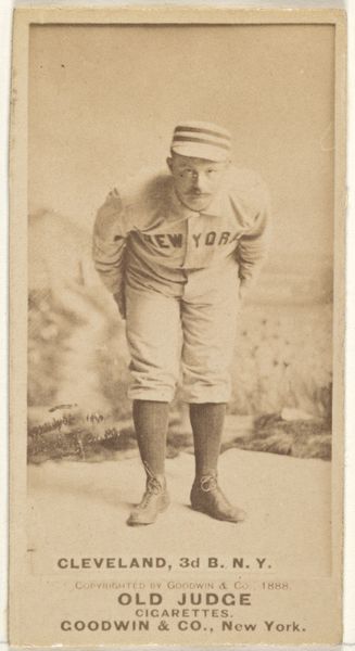 This baseball card of Ledell "Cannonball" Titcomb, a pitcher for New York, was produced around 1888 by Goodwin & Company for Old Judge Cigarettes. It's a small albumen print, a photographic process popular in the late 19th century. Albumen printing involved coating paper with egg white and then a silver nitrate solution, making it sensitive to light. The negative would then be pressed against the prepared paper and exposed to sunlight. The resulting image has a distinctive sepia tone and a smooth, glossy surface. The process itself was labor-intensive, involving a skilled photographic technician and the mass production of negatives. What's interesting here is the intersection of sport, celebrity, and industrial production. The card was not made for art’s sake, but to promote consumption. Consider the number of these cards made, handled, and discarded. This mass production is key to its cultural significance, capturing a moment in baseball history while simultaneously reflecting the burgeoning advertising industry. By considering the materiality and context of this baseball card, we can see how it challenges traditional distinctions between fine art and everyday ephemera.