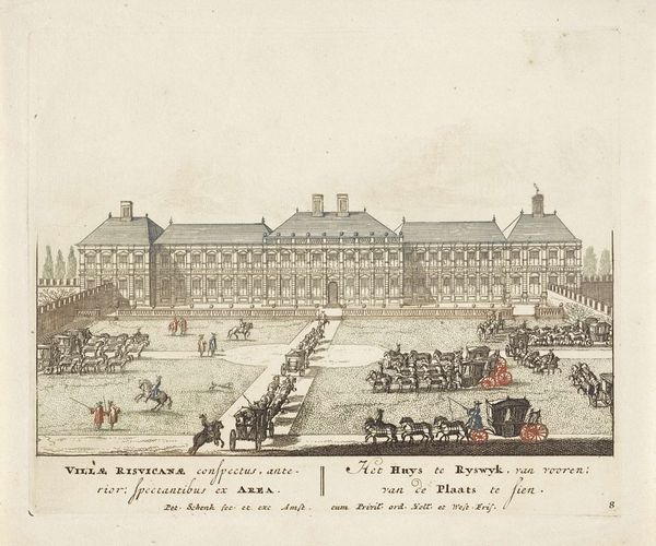 Curator: Look at the detail in this print; you can see "View of Huis ter Nieuburch in Rijswijk" created by Jan van Vianen in 1697. Editor: It has such a regimented formality, doesn't it? A monumental building taking center stage and full of figures, it immediately conveys power and a bit of an ominous mood to me. Curator: Indeed. Jan van Vianen made it as an engraving, it represents much more than just architecture, think of Dutch Golden Age values with colonial intersection of power; also this country estate in Rijswijk where the Treaty of Rijswijk was signed, marking a turning point in European political power structures. The formal gardens would be further reinforcement of that power on display, a demonstration of mastery of both people and land. Editor: That makes sense given the subject. It looks very costly to build something of this scale and level of grandeur, so yes the political history must certainly be highlighted given how social dynamics played out during this time period as well and to what end for these colonizers to enjoy such leisurely lifestyles. Can we also talk about the material qualities that engraving offers? Curator: Most certainly! How the technique lends itself to these political assertions is certainly part of the dialogue as well. Engraving like this was skilled manual labor. I understand your impulse to investigate the labor behind creating something so impressive in this view, too. The detailed work celebrates material creation during the Baroque. Editor: Absolutely! Each precise line, each calculated mark serves a purpose. Thinking about this painstaking process enriches the historical context. These details show how materials and labor are tied to the overall impression of political stability and societal power, it really brings into view the social underpinnings for displays of such magnitude to viewers in their context. Curator: I agree! Exploring this print, from its materials and its relationship with political identity and race in a moment in Dutch history helps me connect the work's production with the broader issues in a deeper, intersectional way. Editor: Me too. Considering materiality gives insight into society and even helps reveal undercurrents, shifting relationships of consumption, production, and what such luxury entailed at this pivotal turning point in sociopolitical history.