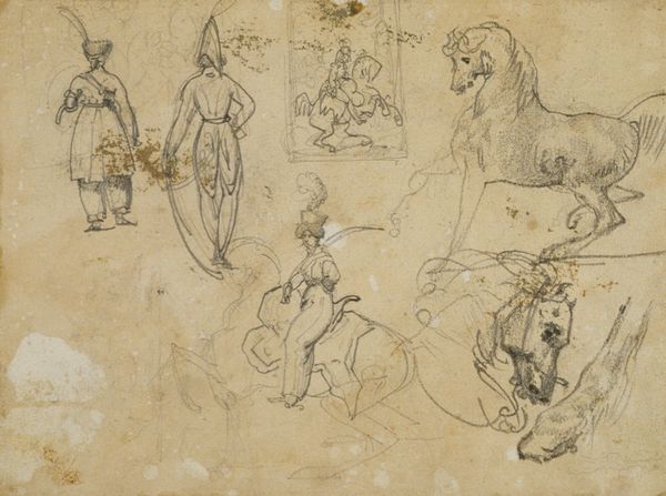 Editor: So, this is Géricault’s “Sketches of a Cavalry Battle, A Landscape with Cows, and Other Compositions,” from around 1814. It's done in pencil and ink, various drawings all on one page. It feels like a glimpse into the artist’s mind, a jumble of ideas. What jumps out at you? Curator: Well, isn't it like stumbling upon someone's intensely private sketchbook? These aren't polished declarations; they're whispers of creation. I'm drawn to the contrast. We have this chaotic, almost feverish, battle scene, then, right next to it, these peacefully grazing cows. The romantic artist struggles between heroic ambition and simple bucolic pleasures. Doesn’t that dichotomy just echo within all of us, really? Which "composition" speaks loudest to you? Editor: I'm drawn to that figure, hunched over, almost fetal. Is it grief, exhaustion, surrender? It is interesting contrasting with the cavalry sketches… Maybe both are related. War leading to despair? Curator: Absolutely! That figure *is* the aftermath, isn’t it? A raw, unflinching look at the human cost, that follows every grand charge, every noble battle depicted elsewhere on the page. It is Géricault pulling back the curtain on the heroic mythmaking so prevalent at the time. It's not all triumphant flags and brave steeds; there’s a broken body left in the dust, grappling with what happened, you see. Editor: I see, almost like two sides of the same coin. This one sketch embodies Romanticism itself, in both its grand ideals, and brutal reality. Thanks! Curator: My pleasure! We’re all just sketches in progress, aren’t we?