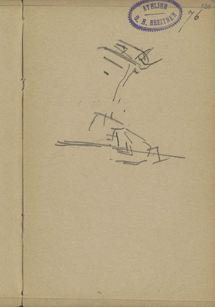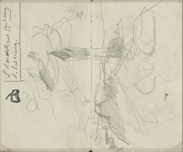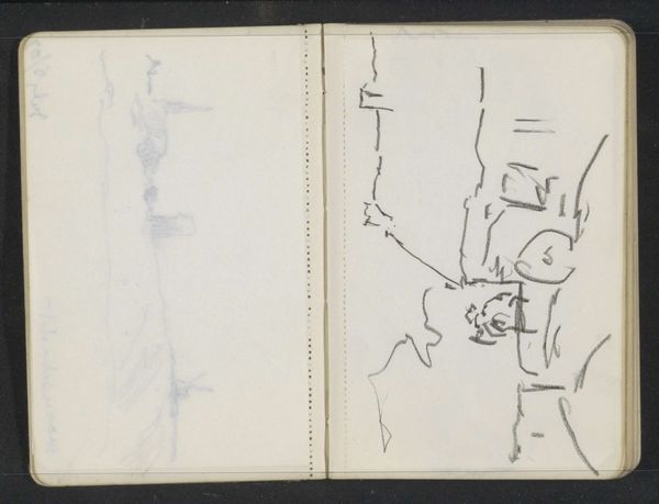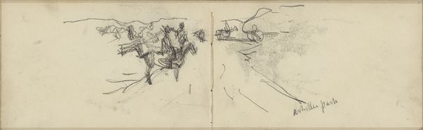 Curator: This sketch, titled "Soldaat te paard," or "Soldier on Horseback," was created by George Hendrik Breitner between 1887 and 1891. Breitner was a key figure in the Dutch Impressionist movement. You can see it currently at the Rijksmuseum. It's executed in graphite and pencil on paper. Editor: Oh, my first thought? It's like a whisper of a moment. Barely there, but the energy! I feel the horse's restless shift and the soldier's... I don't know, maybe a world-weariness etched into just a few lines. Curator: Yes, exactly! Breitner was known for capturing fleeting moments of urban life, and while this is not strictly urban, you can see that impressionistic desire to grasp the immediate. It's likely from one of his sketchbooks, a quick study rather than a finished work. Editor: Which, to me, makes it even more intimate. You're seeing the artist thinking, feeling, *right* there on the page. Look at the economy of line, how he suggests form with so little. Curator: Precisely. Breitner's style evolved during this period. He moved towards a more raw, immediate representation of reality, influenced by his interest in photography. This sketch demonstrates how he distilled complex scenes to their essence. Consider also, how military themes were circulating at the time, fitting with a resurgent nationalism in Europe, so Breitner is certainly working within that historical framework. Editor: Mmm, and while I see that context, I'm also just struck by the vulnerability of it. Soldiers, horses… they are usually monumentalized in art. But here, there’s nothing grand. It’s a sketch from life, ordinary even in its subject matter. Like catching a glimpse of a private, pensive moment of both man and beast. And maybe, because it's just lines on paper, it reflects also our understanding of their place in history, equally fleeting and undefined. Curator: It is a beautiful paradox: capturing the monumentality and ordinariness, side-by-side. Editor: Exactly! It leaves so much space for our own interpretation, for feeling the moment rather than just knowing the story. Curator: I agree. Studying works like this reveals much about Breitner's process and also how art reflects larger socio-political currents. Editor: It's a tiny little window. Peeking in at a particular soldier, horse, and artist all at once. Beautiful.