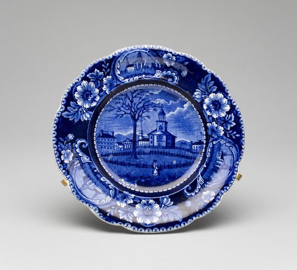 Curator: Right, let’s discuss this intriguing piece of earthenware from the Rijksmuseum collection, “Vrienden in Nood,” or "Friends in Need," created in 1918 by De Porceleijne Fles. What’s your initial read on this Dutch Golden Age style painting? Editor: Stark. Visually, the strong blue and white contrast certainly jumps out. And then, there's a certain anxiety present in the overall impression... it's that precarious-looking cauldron hanging over the blazing fire, right? It looks both domestic and somehow urgent. Curator: Indeed. The symbolism is potent. The fire represents, of course, warmth and sustenance. But look at the "friends in need"—this visual scene clearly refers to enduring hardship. It would be interesting to investigate how World War I impacted the populace when it was made, or its original owner. Editor: Exactly! Context is key. The home space would become all the more significant. Look at how everything seems carefully considered... even down to the neat stack of logs ready to fuel the fire, next to what appears to be a bottle and an axe. It reads like a symbolic still life... with distinct political messaging embedded in it! Curator: Consider how these carefully arranged objects play a central part in cultural storytelling and collective memory, even a century later. But consider the phrase painted on it, what do you read into that specific placement? The war and hardship made worse or heightened the true connections between friendships. Editor: Placing text inside the art, that is particularly smart because we may look back and remember them for longer because of how they make us feel when recalling our friends in need or when we were in need of them. The fact that it makes use of delftware motifs in order to do so really underscores how war can intrude even into seemingly stable cultures and styles. Curator: You raise a vital point. These motifs ground the depiction in a tangible heritage even when faced with modern conflict. Its message serves as a time capsule to a pivotal historic time and our human condition overall. What an interesting symbol! Editor: Absolutely, it makes you think about how societies remember and commemorate events through images... objects made for home life become these powerful sites of social and political expression. Curator: Ultimately, that enduring function in which these works help inform social perception is still relevant and why this piece resonates to this day. Editor: Agreed. An arresting image with important cultural history loaded inside, ready for all of us to decipher through both the political environment and iconographical clues.