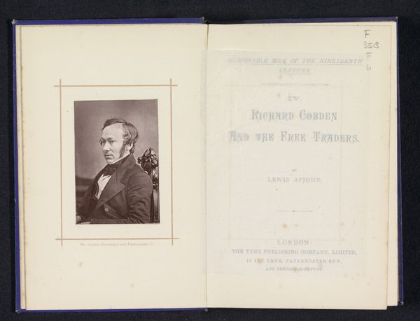 Curator: What strikes you first about this image, aside from its obvious vintage charm? Editor: Oh, instantly, the light. It’s muted, almost ghostly. Like peering into a memory, distant and a bit hazy around the edges. Then, the asymmetry. One side feels weighed down by a shadowed portrait, the other balanced by the density of the text. It’s got an intriguing imbalance to it, which, honestly, hooks me right away. Curator: That portrait you mention faces us from the left page. Across the opening, we have the title page to "William Ewart Gladstone: His Life and Times," identified as number one in a series called "Memorable Men of the Nineteenth Century." It’s credited to Lewis Apjohn, published around 1880 by The Tyne Publishing Company in London. Editor: "Memorable Men..." it smacks of Victorian seriousness, doesn't it? But that portrait… it’s so delicately rendered, like a whisper of a face, and yet positioned next to this very bold typeface, "WILLIAM EWART GLADSTONE." There's a tension, a dialogue almost, between intimacy and historical record, public image and private persona. I find that dichotomy fascinating. Curator: Absolutely. The typeface is quite remarkable; thick and rather elaborate, indicative of the era's design sensibilities. The combination creates an aura of solemnity and importance but, to me, it suggests something else too. Look how it mimics a handwritten script—almost suggesting authenticity. It speaks of individuality within the grand narrative of history. Editor: It's true—and there’s this fading quality that emphasizes age, like we're discovering it after ages lost in someone's attic. Curator: Think about it, icons in manuscript books had power beyond the images that referred to people. Type and pictures are often seen in the same context to lend an evocative connection to faith, truth and even propaganda. Editor: Exactly. Now I'm left pondering the essence of historical portrayal. Are we merely observing a relic, or are we subconsciously engaging with a dialogue, a contrast that history relentlessly thrusts upon us. It's all deeply intriguing.