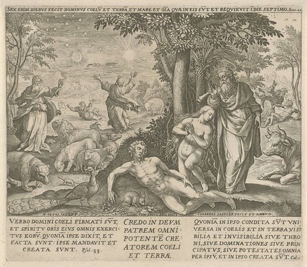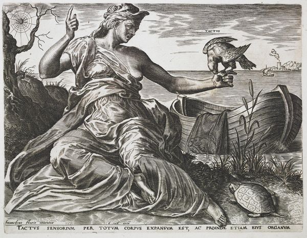 Curator: This engraving, simply titled "Taste," was created by Cornelis Cort, a Dutch artist from the 16th century. Editor: It's like a garden dream! The lush setting and abundance of fruit create this sense of earthly delight, yet something feels slightly off, doesn't it? Curator: Absolutely. Notice how the woman personifies taste, surrounded by the bounty of nature. But the monkey in the background, chained, adds a layer of constraint. Editor: Ah, that’s it! The monkey represents unrestrained appetite, while the woman embodies a more refined, perhaps even controlled, experience of flavor. The artist is highlighting this tension between indulgence and temperance? Curator: Precisely. It makes you consider how we savor experiences, and the choices we make between pure indulgence and mindful appreciation. Editor: It also makes me question what I'm really hungry for. Is it the apple, or the awareness? Intriguing!