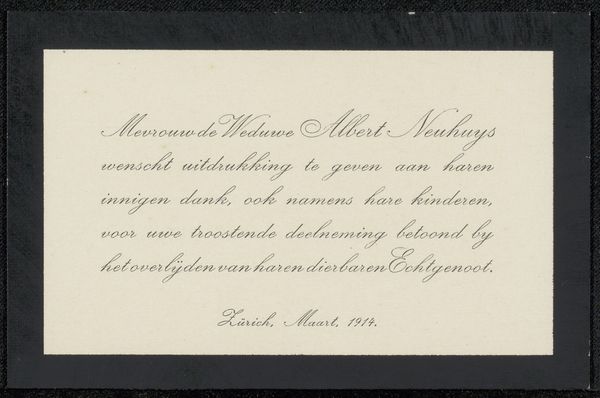 This is a thank you card to Philip Zilcken from an anonymous artist, created in June 1903. At first glance, the composition seems simple: black ink on a cream surface, a study in contrast and clarity. The names, meticulously listed, create a rhythm of forms, each letter a tiny architectural element. These names, carefully arranged, are not merely identifiers but become visual components. The repetition of "Thorn Prikker" functions almost like a musical motif, binding the composition together. The card, in its design, evokes questions about identity, artistic communities, and the act of recognition. Does it challenge fixed meanings? The careful distribution of names and the elegant script transform a utilitarian object into something more profound. It asks us to consider the aesthetic dimensions of everyday communication. The formal qualities of the card—its balance, typography, and the interplay of light and dark—elevate it, prompting us to see beyond the surface and engage with the ideas it subtly communicates.