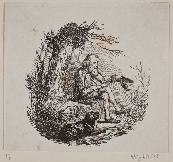 Editor: Here we have "Beggar under a Willow Tree," a woodcut by Andreas Flinch from 1841, currently held at the SMK. There's a melancholy feel to the print, accentuated by the stark lines of the engraving, don't you think? What draws your eye in this piece? Curator: Indeed. My initial focus is drawn to the strategic deployment of line – its density to articulate form and texture, its sparseness to define the periphery. Note, for instance, the contrast between the meticulous rendering of the beggar's garments and the comparatively abstract execution of the surrounding foliage. Do you observe how this juxtaposition directs the viewer's gaze? Editor: Absolutely. The sharp lines used to depict the beggar's clothing and the dog create a strong sense of realism and detail, almost in contrast to the more sketch-like treatment of the landscape. Is the purpose of this stylistic contrast to enhance the focal point of the woodcut? Curator: Precisely. This strategic manipulation of visual elements compels a dialogue between the observer and the observed. Moreover, let us consider the compositional balance achieved through the triangulation formed by the beggar, the dog, and the supporting tree trunk. The arrangement isn’t merely representational; it embodies a structured harmony, inviting deeper semiotic interpretation. How do you view that aspect? Editor: The triangulation does add a certain stability and order. It's as if the artist is attempting to find structure in a scene that depicts poverty. I am struck by how every line feels deliberate and contributes to a structured whole. Curator: Indeed. Every element functions not as an isolated entity but as a component of an intricately constructed visual ecosystem, inviting prolonged contemplation of its inherent formal relationships and aesthetic architecture. Editor: That’s fascinating! I hadn't considered how deeply interconnected all of those details are to the work's overall visual structure. Curator: These works exemplify the transformative power of artistic vision, through visual syntax alone, inviting viewers to engage in nuanced interpretations.