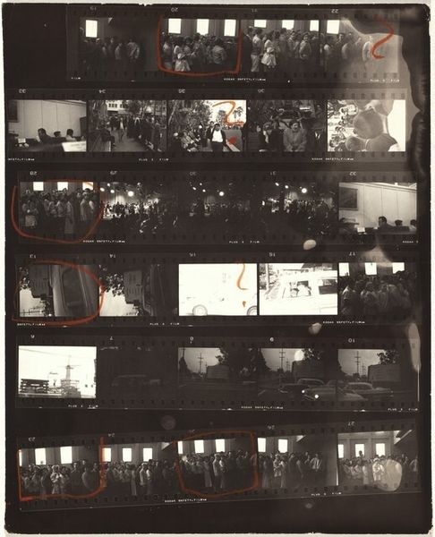 Robert Frank created this intriguing collage of black and white photographs, likely in the late 20th century, offering us a peek behind the scenes at Twentieth Century Fox Studios. It's a reminder that art isn't just about the finished product, it’s also about the process, the journey, the outtakes and the editing. The texture here is grainy, raw, like a secret document. Look at the red marks on the film strip, like notes scribbled in the margins. The film strip itself becomes a physical object, a thing to be handled and marked. I like the contrast between the staged world of the studio and the artist's markings, like a conversation. It reminds me of how we all see things differently, and how an artist can make us question what we think we know. This piece feels like a precursor to the work of someone like Gerhard Richter, who also explores the relationship between photography and painting, and the ways in which images can be both representational and abstract. In art, there are no fixed meanings, only possibilities.