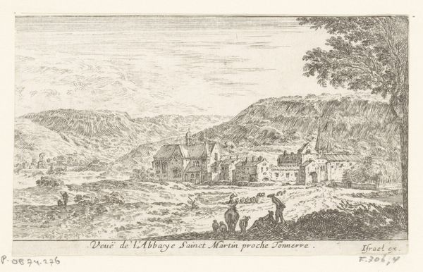 Editor: This etching, "Gezicht op het dorp Sainte-Reine," was created by Israel Silvestre around 1650. It's quite detailed, depicting a small village nestled in a hilly landscape. What strikes me is the strong diagonal composition leading the eye into the depth of the scene. How do you interpret this work from a formalist perspective? Curator: Indeed. Focus then on the systematic organization of visual elements, especially spatial composition. Consider how the diagonal path functions as a primary structuring device. What effect does it achieve, leading from the foreground figures to the village and beyond? Note how line and form intersect to delineate every element within a comprehensive perspectival scheme. Editor: I see what you mean. The line work creates definition while also controlling perspective. It makes the hilltop village in the center a point of visual interest. Would you say the artist used a particular formal technique to add such clarity? Curator: Silvestre employed the etching technique skillfully to achieve linear clarity. Notice the contrast in line weight; thicker lines define the architecture while finer lines suggest distance. And consider, too, the surface of the paper itself as an integral component. How might this materiality alter or underscore an interpretation of Silvestre's intentions in presenting a vision of Sainte-Reine? Editor: It almost seems like a calculated visual strategy for making the village inviting yet also conveying that sense of space... Now that I observe all the marks composing the artwork, it gives it character and feels handmade, defying what I assumed before! Curator: Precisely. Reflect on what has transpired through the analytical observation, for the most rudimentary elements might harbor critical compositional properties.