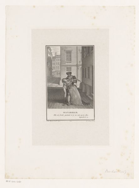 Curator: This print by Jean Bosq, dating from 1811-1813, is titled "Young woman with nobleman, stopped by her father". It's an etching, quite detailed. What strikes you most about it? Editor: The scene feels very staged. The architecture suggests a specific place, while the characters remind me of theatre players, particularly the contrast in clothing and pose of the characters. I wonder about the artist’s choice of the etching medium, its specific line qualities and details, and how it enhances or shapes the narrative. What is your perspective on the piece? Curator: From a materialist perspective, let’s think about the social context and production. Etchings were relatively accessible; prints like this circulated widely. Who would have been the target audience? Editor: Probably people who wanted a somewhat affordable way to get their art fix. Prints being reproducible could offer a wide spectrum of access to the less affluent perhaps? Curator: Precisely! These kinds of genre scenes depicted everyday life. So the scene suggests more than just a narrative. What can it reveal about class and gender relations in early 19th-century Paris? Notice how the figures are arranged in this cityscape—how the labor of production comes together in it and becomes commodified as a symbol of power. Editor: Now that you mention it, the father does seem to block not just the nobleman, but access to the backdrop beyond them as well. Curator: Exactly. And considering this was produced during a period of significant social upheaval, that 'everyday life' is a product, a constructed representation made possible by the very specific economic conditions and artistic labour. Editor: This makes me consider how the production of art reflects society's own struggles, class divisions and gender bias. Now, what used to simply feel as 'the backdrop', shows itself as another powerplay on its own. Curator: Indeed! It reveals how art materials, means of production, and visual composition all contribute to reinforcing or challenging dominant social norms.