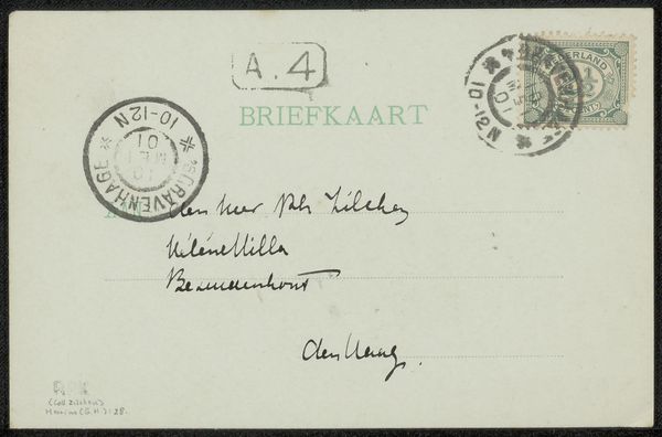 Editor: Here we have "Briefkaart aan Philip Zilcken," a postcard, possibly from between 1903 and 1928. It looks to be made of paper with ink, and there’s a photographic element I assume comes from the picture on the other side. It’s just… a postcard. What can we even read into something so simple? Curator: A postcard is never *just* a postcard. They tell us about communication practices, societal literacy, and the visual culture of the era. This one, addressed to Philip Zilcken, offers insight into the social circles of the time. Consider the act of writing itself. Editor: What do you mean? Curator: Writing was much more formalized. The penmanship suggests a level of education and a dedication to presentation lost today. It’s addressed to a specific person in a particular location. Who *were* Philip Zilcken and Helene Aillw, and what was their place in society? The 'RPK' stamp suggests provenance: perhaps a collector who saw value in preserving this ordinary piece of ephemera. That collecting, in itself, shows that art and social history are connected. Editor: So you’re saying even something as mundane as a postcard becomes interesting once we consider its context and history. Curator: Exactly! The stamp, the address format – it's a snapshot of a bygone era's visual language and postal system. Each of these details can provide information for researchers exploring early twentieth-century culture and communication. Editor: That really makes you think. I would have just dismissed it. Curator: That’s why approaching art through the lens of its history makes the mundane into something compelling! We have to be cultural detectives. Editor: Thanks for illuminating what might otherwise have remained just an old postcard! I’ll look at such items differently from now on.