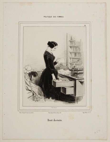 Editor: This is Paul Gavarni's "Right of Visit," and the medium looks like ink on paper. I'm struck by the somber mood and the woman's enclosed space. How do you interpret this work? Curator: It's evocative, isn't it? Gavarni, working in 19th-century France, presents a woman amidst her private documents. "Right of Visit" perhaps subtly critiques the limited spaces afforded to women, both physically and intellectually. The open drawer feels like an invitation to examine what's typically concealed. What does this act of unveiling suggest to you about gender roles and privacy? Editor: It suggests a tension between the expected domesticity and a woman's inner life. I hadn't considered the critique of limited spaces, but that makes sense. Curator: Exactly. By juxtaposing the woman, her private correspondence, and the title, Gavarni prompts us to question the societal "rights" and restrictions imposed upon women during that era. Editor: This gives me so much more to think about regarding women's roles and expressions in art!