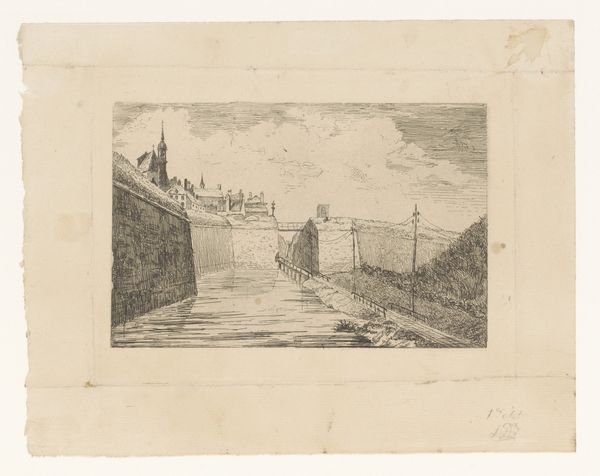 Editor: This print, "View of a Jetty and Houses in the Port of Enkhuizen," made by George Marinus Tamson in 1912, really draws me in. There’s almost a serene quality to it despite the stark black and white contrasts. It feels… deliberate. What do you see in this piece? Curator: Deliberate is a great word for it! The artist meticulously details the harbour. For me, it’s an intimate portrait of a specific place at a specific moment. Can you imagine standing on that pier, feeling the slightly salty breeze? But there's also a stillness here, don’t you think? Editor: Yes, a definite stillness. It feels like a quiet observation, almost meditative. Is that something typical of landscape etchings from that period? Curator: Interesting thought. There was definitely a vogue for capturing the 'spirit of place' then, a desire to connect with and understand the landscape, especially as industrialisation changed things. The geometric elements stand out against the more fluid depictions of nature, which speaks to modern approaches of that time. This interest in a formal structural approach feels somehow at odds and perfectly at peace with nature. How about you, did your feelings change by focusing in? Editor: It has, actually. Seeing that tension, that delicate balance between geometry and nature…it makes it feel a lot more dynamic. Curator: Absolutely! I think we've found a secret ingredient there, then. A landscape portrait and a symbol.
