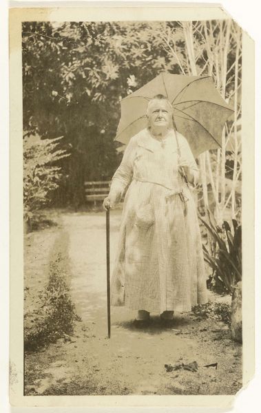 Editor: This gelatin-silver print, taken by Hendrik Doijer between 1903 and 1910, is titled "Hindostaanse contractarbeider op Plantage Jagtlust." The indigo hue and simple composition give it a dreamlike, almost ethereal quality. What symbols or deeper meanings do you find present in this image? Curator: The entire image acts as a symbol. The woman's clothing, the modest dwelling behind her, and even the flora surrounding her represent a complex tapestry of cultural exchange and displacement. The "contractarbeider," or indentured servant, isn't just a worker but a carrier of heritage in a new landscape. Do you notice anything in her stance that might tell us about her psychological state? Editor: Her upright posture suggests resilience, but there's also a sense of quiet acceptance in her gaze. Perhaps a mix of pride and resignation? Curator: Exactly! Her body language speaks volumes. Consider the bangles on her wrists. They are not merely decorative; they could signify marital status, regional affiliation, or even act as talismans. The photograph becomes a record—a visual document imbued with coded information that whispers secrets of cultural memory. How does the limited color palette impact the symbols? Editor: It almost unifies everything. The blueness simplifies the complex scene, inviting closer inspection of details that might otherwise be overlooked. It heightens the symbolic weight. Curator: Precisely. This monochrome filter directs our attention to the underlying symbolism – a subtle yet potent tool employed by Doijer. In essence, he captures not just an image but a fragment of history, imbued with profound symbolic value that prompts reflection on themes of identity, labor, and cultural perseverance. Editor: It's fascinating how one image can contain so many layers. I never considered how deeply symbolic a simple portrait could be. Curator: And how a single image could be so revealing, serving as a cultural mirror for both the subject and the viewer.