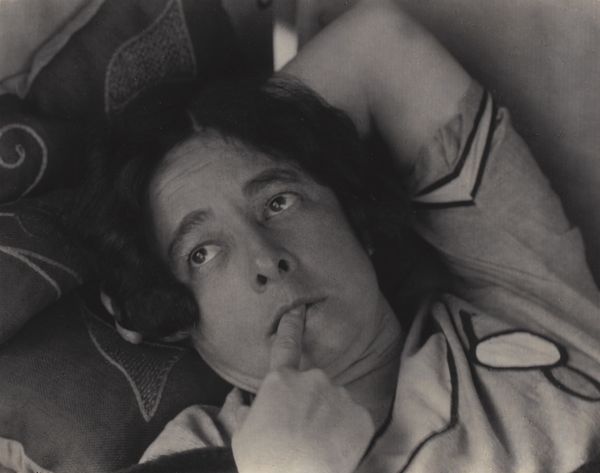 Curator: This is Alfred Stieglitz's photograph of Katharine Dudley, a gelatin-silver print from 1922. Editor: It exudes a quiet intensity, almost confrontational despite the muted palette. There's a directness in her gaze that holds you. Curator: Yes, the composition, predominantly grayscale, allows the gaze and her thoughtful pose to command attention. The subtle gradations emphasize form. Editor: The date situates this within the burgeoning feminist movement. I can't help but wonder about the kind of intellectual circles Dudley navigated at the time. The gaze challenges patriarchy head on. Curator: The soft focus aligns with pictorialist aesthetics, but it also hints at modernist experimentation, blurring edges yet sharpening the psychological depth of the portrait. Editor: The choice of monochrome simplifies representation, allowing us to deconstruct notions of race and consider identity beyond phenotype, emphasizing individual self-determination at a crucial time for the “New Woman”. Curator: The tight framing concentrates the eye, focusing attention on her face. Her features and hand form intersecting angles. Editor: But even seemingly simple elements like the string of beads around her neck, can also be read as quiet acts of defiance. Such accessories would simultaneously declare respectability while discreetly signaling burgeoning economic freedoms for women. Curator: Certainly, considering her overall pose and placement against the soft light reveals an intentional play of form and shadow which further shapes our perception. Editor: It truly brings forward the ongoing and multifaceted project that art engages in–interrogating who gets to look and at whom, then shaping not just art history but social discourse too. This photograph encourages deep, ongoing conversations! Curator: Indeed. Its elegant structure reflects a modern exploration of portraiture’s potential to uncover internal truths.