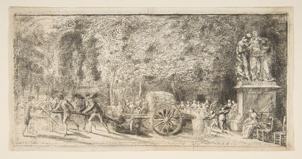 Editor: This is Francisco de Goya’s "Kamp fra en hestevogn trukket af to æsler," or "Fight from a Carriage Drawn by Two Donkeys," an engraving from around 1815. There's such raw energy, despite the muted tones. It’s almost chaotic, this fight unfolding in front of a crowded stadium. What strikes you when you look at it? Curator: Immediately, I am drawn to the archaic quality, the deep historical roots of the scene. A carriage in the bullfighting ring? It echoes the Roman chariot races, doesn't it? Goya seems to be deliberately invoking these cultural memories. And the use of donkeys, not horses… does that suggest a societal critique, a comment on the decadence or absurdity of the spectacle? What emotions does the image evoke in you? Editor: I hadn’t considered that historical connection. It does feel very performative. I suppose I initially just saw the drama and danger, that visceral energy of the bullfight, and of the struggle that ensues when things go wrong. Curator: Precisely. Consider the faces in the crowd, their reactions. Goya captures that spectrum of human response to violence – fascination, fear, excitement. How do you think he uses the stark contrast between light and shadow to enhance those emotions? Editor: The darkness certainly heightens the tension. By placing these darker marks in contrast with lighter ones, our eye really goes to what's highlighted, which intensifies the feeling of chaos. Curator: Exactly! It reinforces this underlying psychological tension between pleasure and danger, spectacle and violence, all these different themes in history...it's really brilliant. Editor: This has given me a fresh appreciation for the cultural layers beneath Goya's work. It makes the experience of observing this print feel quite richer. Curator: And I hope it continues to encourage you to question what we’ve always seen or assumed! Every line in this artwork offers symbolic connections and deeper understandings.