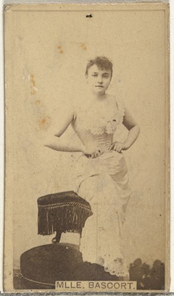 Curator: Mlle. Bascort, from the Actors and Actresses series, likely completed between 1885 and 1891. The piece combines drawing, photography, and printmaking. Editor: It’s got a very hazy, sepia quality, like looking at a dream. The soft focus gives it an ethereal, almost melancholic feel. Curator: Interesting. From a formalist perspective, the composition relies on a delicate balance. Notice how the sitter's posture and the angle of her limbs create dynamic symmetry within the frame. The light subtly illuminates the lace detail in her dress, establishing a strong focal point. Editor: I see it as more complex. This image comes from a cigarette card series, placing this performer within a broader narrative of celebrity and commercialization. How does her positioning—hands on hips, a subtle defiance in her eyes—negotiate the male gaze inherent in this form of popular media? We should remember the historical reality, with these kinds of portraits feeding both the fetishizing dynamics of the era and offering performers a means of self-representation in an epoch with a narrow scope of freedom for many. Curator: Yes, while that’s a relevant reading, observe how the muted palette contributes to the harmony of the portrait. There's an artful distribution of tones and textures which highlights the planar structure of the piece and draws us towards that exquisite needlework. Editor: Agreed, there is mastery in this photo. But in its own way the portrait is about selling a fantasy as much as cigarettes, perhaps unconsciously underscoring the complexities of female representation within the theatrical profession during the period. What did it mean to be a performer, and simultaneously, a commodity consumed through capitalist marketing practices? Curator: In considering how that meaning has changed through the passage of time, hopefully we've aided our listeners in appreciating both the inherent craftsmanship and nuanced complexity within "Mlle. Bascort.” Editor: Absolutely. Examining both form and context allows us to really wrestle with the subject's humanity within, and beyond, the artwork.