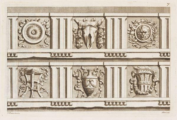 Curator: At first glance, it's quite captivating with its intricate detailing! What do you think? Editor: Certainly impressive. The interplay of shadow and line creates a striking effect. It makes me consider the labor invested in its creation—each stroke contributing to this refined ornamental structure. Curator: Indeed. This is John Yenn's "Design for a Frieze, Ornamented with Lion's Head Paterae," dating from 1770 to 1821. A meticulous drawing employing pencil and printmaking techniques. I find the visual tension compelling, particularly between the rigid geometric forms and the organic foliate motifs. The lion’s head seems strategically positioned as a focal point. Editor: Yes, the material rendering is remarkable. I see echoes of workshops where artisans labored to transpose these designs onto walls and buildings. The choice of such refined patterns in pencil indicates how valued these patterns were; pencil sketches enabled transferal for repetition by many craft workers. One thinks about their contribution in terms of skills rather than creativity itself, even as this ornamental language projects messages about elite values through neoclassical symbols—its production history needs uncovering too Curator: Precisely! Observe the Apollonian clarity of its composition—the symmetry, the balanced distribution of weight, and the calculated use of light and shade to accentuate depth. Each element adheres to classical principles of order and harmony. Editor: I agree, and understanding the context reveals even more of its complexity! It would be useful to unpack where that labour came from at this moment in history in this building! Was it made using local hands from across town or enslaved hands from abroad whose labor would have enriched its intended commissioners lives by freeing them from making things directly but then, it all collapses; its aesthetic appeal now carries further weight when understanding how it actually got produced... Curator: Yes, this exercise really invites speculation, doesn't it! It highlights how artwork analysis brings differing viewpoints depending how you approach things--the creative impulse is more multi-layered than people realize . Editor: True! Looking closer shows us far more than expected; what happens with our understanding influences even perception too!