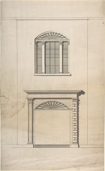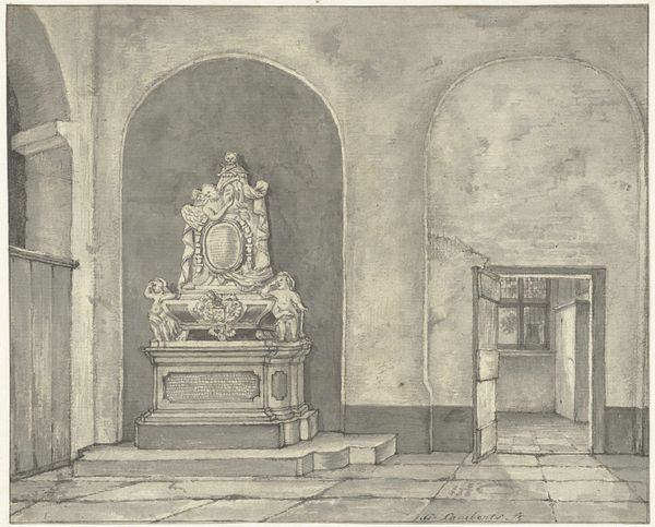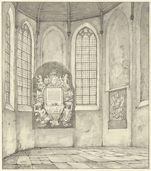 Curator: This ink and pencil drawing by Gerrit Lamberts from 1842 gives us a glimpse into the church at Zandvoort, focusing on the chapel and burial vault of the Lords of Zandvoort. It’s currently held in the Rijksmuseum. What are your first thoughts? Editor: Somber, definitely somber. The grayscale palette, the architectural rigidity…it evokes a profound stillness. Notice how Lamberts frames the tomb entrance with those robust columns. The structure is clearly intended to convey permanence, maybe even eternity. Curator: The permanence of memory, certainly. The Lords of Zandvoort, though physically gone, are visually and symbolically present in the village church. Note the skull and perhaps a knightly emblem positioned at the top of the structure – visual reminders of mortality and perhaps social hierarchy. Editor: Right, a vanitas motif perched atop neoclassical formality. The juxtaposition creates a visual tension. And those meticulously rendered gothic windows allow light to enter. Are they illuminating the physical space or suggesting a transcendent plane? The contrast contributes to the overall effect of staged austerity. Curator: Gothic windows traditionally symbolize enlightenment, acting as conduits between earthly and divine realms. Here, their presence emphasizes a continuity – the ancestral past interweaving with the town's evolving religious and cultural identity. The vault embodies a kind of collective cultural memory. Editor: And technically, consider the sketchwork: the quick strokes capturing light on the columns, the more precise rendering of the window details…there is a fascinating oscillation between spontaneous notation and considered formal analysis. This tension, or ambiguity, amplifies its complexity. Curator: The artist seems less intent on pure representation and more interested in capturing the atmosphere and evoking symbolic weight. I find it fascinating how something rendered in such simple media can contain layers of societal implications. Editor: Agreed. It’s a testament to the potency of understated expression and the eloquence of formal composition. Even an unfinished sketch, such as this, allows us to ponder beyond the picture’s edge.