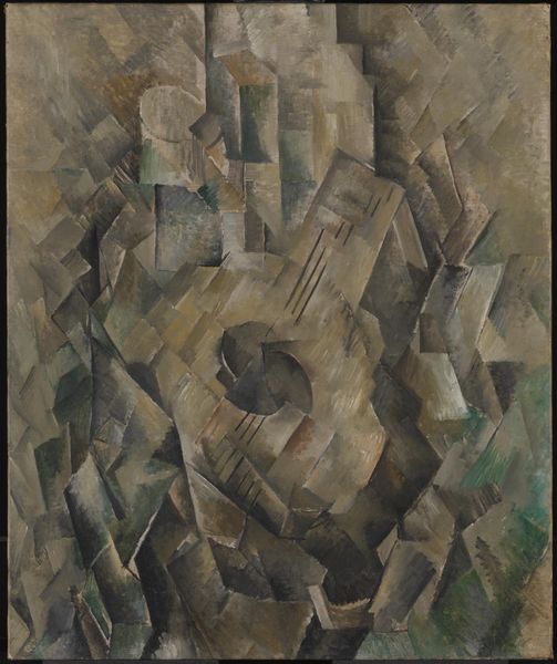 Editor: This is Picasso’s "Femme Assise," painted in 1909 using oil paints. It's...fragmented, isn't it? I see shapes where a person should be, and muted colours. What do you make of this piece? Art Historian: Indeed. Observe the artist's meticulous application of paint to construct planar surfaces. The interlocking forms do not simply represent a figure but actively participate in constructing the picture plane itself. Editor: So, it's less about representing a person realistically, and more about how the shapes and colours work together? Art Historian: Precisely. The almost monochromatic palette and fractured forms eschew conventional mimetic representation, and force us to examine the underlying structure. Consider the subtle gradations of tone—how do they contribute to your perception of depth and volume despite the flattened perspective? Editor: I guess the shading creates a sense of three-dimensionality, even though the figure is broken up. It’s almost like a puzzle... were his contemporaries as confused by this style? Art Historian: No doubt some were challenged by such radical departures. This Analytic Cubist style represents a critical moment in the development of modernism. Here we see art investigating its own representational methods, stripping them bare and presenting the very language of painting for our inspection. Notice how Picasso avoids the use of a single-point perspective; instead he has fragmented it with the lines, textures and neutral hues of green, white and tan. What implications does this structural rendering yield for the semiotic breakdown of subject, the sitter? Editor: I hadn’t thought about it as language, but now I get it. It’s less about *who* she is, and more about *how* Picasso has constructed her image using paint. That really changes how I look at it. Art Historian: Precisely. One departs, enriched by having encountered the object in its complexity, where our perspective shifts due to the careful orchestration of forms, rather than merely seeing the depiction of something we already know.