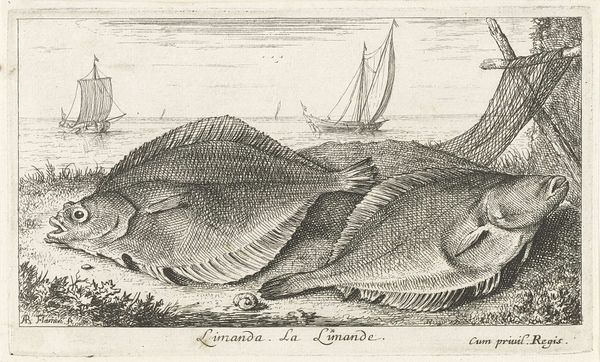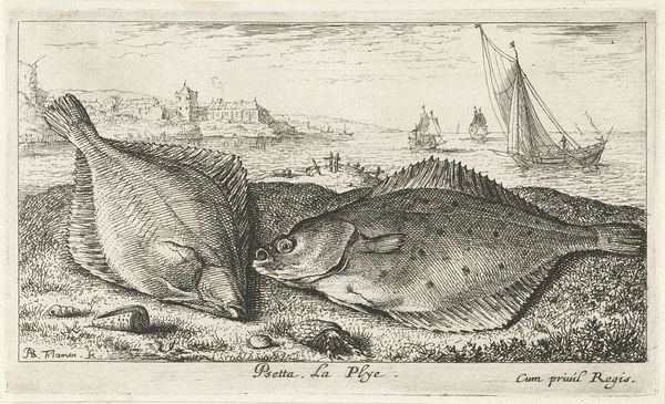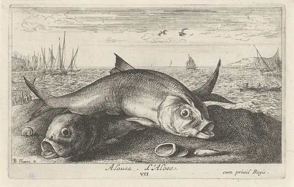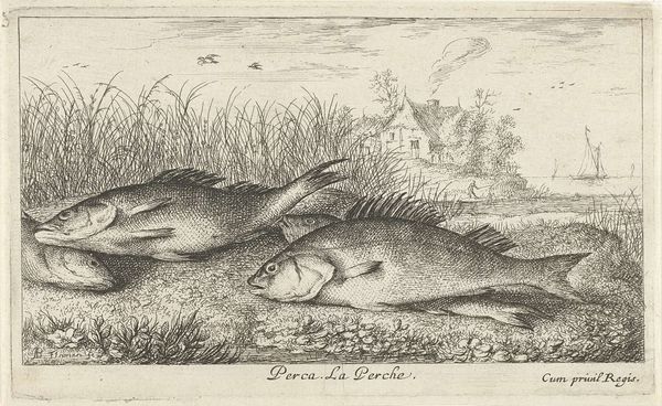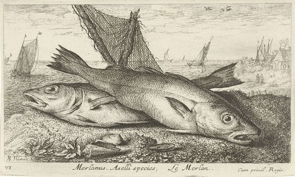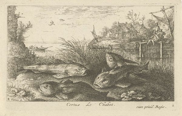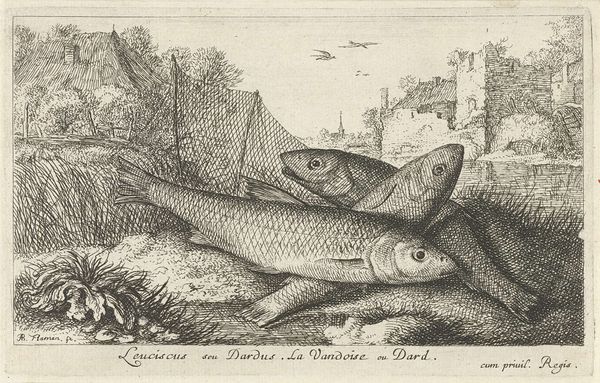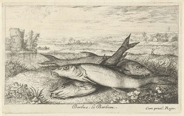 Albert Flamen created this etching, titled "Four Tench on a Riverbank," capturing a still life of fish against a serene waterside backdrop. The fish, specifically tench, are not merely objects of observation here; consider how aquatic life has long been a potent symbol. In early Christian iconography, the fish represented Christ, a visual cipher used by believers in times of persecution. Elsewhere, in more ancient traditions, fish are emblems of fertility and abundance, their scales echoing the myriad blessings of the natural world. Note how Flamen has arranged these tench, their bodies overlapping, their eyes seemingly lifeless. This echoes the vanitas tradition, where such depictions prompt contemplation on mortality and the transient nature of life. The image calls to mind a primal confrontation with death, a stark reminder of our own ephemeral existence. It’s a motif that resurfaces throughout art history, each time imbued with the ever-evolving anxieties and philosophical musings of its age. As we journey through time, we see how symbols persist, morph, and re-emerge. This cyclical progression reflects our ongoing dialogue with fundamental aspects of human existence.