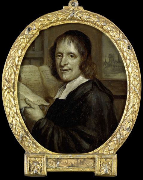 Arnoud van Halen created this portrait of Karel Verloove, a poet in Amsterdam. Note the laurel frame, an ancient symbol of triumph and honor, encircling Verloove's image. The laurel wreath, with roots in classical antiquity, was bestowed upon victors and poets alike. We see its echoes in Roman sculptures and Renaissance paintings, each time signifying excellence and immortality. Consider how this motif, originating in pagan rituals, was later adopted during the Renaissance to convey the revival of classical ideals. It speaks of a profound human desire to connect with the glories of the past. The laurel also speaks to our collective memory, a symbol continually reborn through human creativity. In this portrait, it subtly elevates Verloove, suggesting his poetry strives for timeless recognition, engaging viewers on a deep, subconscious level with its connection to themes of glory and remembrance.