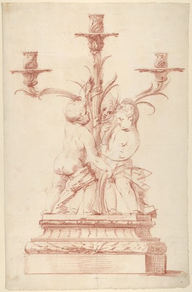 Editor: So this is "A Reliquary of Saint Sigismondo," a drawing done in 1719 by Giovanni Battista Foggini, using ink. I find the use of line to create depth really interesting, and the baroque style gives it a certain grandeur, even in this preparatory sketch. What's your take? Curator: What strikes me immediately is how this ink drawing embodies the transition of an idea, a plan, through material means. Foggini wasn't just visualizing a reliquary; he was actively shaping its production. The very act of sketching, the repetitive, skilled labor involved in the ink strokes, dictated the form it would eventually take. Editor: So, you're focusing on the physical process? Curator: Precisely. Consider the economic aspects: who supplied the ink and paper? What was Foggini's commission? The Baroque style wasn't simply an aesthetic choice; it was a highly marketable commodity, dependent on patronage and skilled artisans. Every line, every flourish, represents a material investment and a social relationship. Look at the detail in the floral ornaments - a clear demonstration of labor. Do you see any contradictions arising from the depiction of saintly devotion combined with the work required? Editor: Well, it does seem like the opulence of the reliquary, which requires considerable work, clashes a bit with the ideas of simplicity often associated with sainthood. Curator: Exactly. It is a commodity manufactured by many to praise humility. It makes you think, doesn't it? Editor: It really does. Thanks, I hadn’t thought of analyzing the sketch in those terms before! Curator: Glad I could illuminate it for you; the material conditions are too often overlooked.