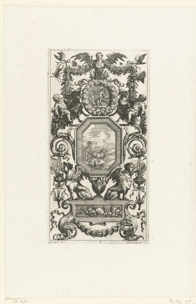 Curator: Good morning. We're looking at "Ornamentele rotspartij met watervallen en in het midden een monogram," which roughly translates to "Rocky landscape with waterfalls and a monogram in the center." Gerrit Visscher created this engraving sometime between 1690 and 1710. Editor: My first thought? So much detail, yet so calming. The monochromatic palette and those delicate lines create a really dreamlike quality. I could get lost in that flowing water for hours. Curator: Visscher was clearly playing with Baroque conventions, but with a unique spin. Baroque landscapes often glorified power, didn't they? Here, the waterfall becomes an almost decorative backdrop for the central monogram. Water—power—subservient to the name. I think it also connects to a larger artistic tradition of emphasizing personal identity and nobility in 17th-century Dutch art. Editor: I love how that monogram anchors the composition. It’s surrounded by these organic elements but still takes center stage. Is that Visscher's monogram, do you think? The artist inserting himself into this crafted landscape feels almost playful. Curator: It's definitely a deliberate act, layering the self within this idealized scene. And notice the subtle contrast between the untamed wilderness and the incredibly precise engraving technique. There's a tension there between natural chaos and human order that makes the artwork particularly compelling to me. It speaks about control and human aspirations during the time period. Editor: That tension is palpable! For me, seeing nature tamed and harnessed like this, especially in what is ultimately graphic art, speaks to a desire for control over one's image and legacy during the Baroque period, when everything from politics to personal relationships was stylized. The waterfall seems almost like a symbol of how humans were starting to mold the natural world. Curator: Exactly! A beautiful reflection of that moment. It invites you into the intricacies of 17th-century perspective—an artificial reality meant to showcase mastery of both the natural world and artistic skill. Editor: I find myself rethinking what power really meant in that period, away from the grandeur we often associate with Baroque art, towards something more personal and controlled. Curator: I’m going to leave here wondering about all the unacknowledged women also living and creating during Visscher's life. Perhaps making marks that did not center masculine identity. Editor: Absolutely. Art historical landscapes and botanical archives—who knew that this genre could be used as an activator in art? Thanks, Gerrit!