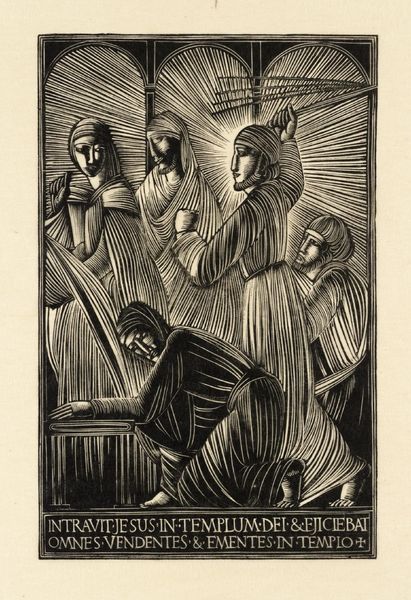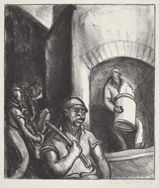 Editor: So, this print, "News" by Frederick D. Jones, looks like it's probably a woodcut or a relief print on paper. It’s stark, black and white, and shows a group of people reading newspapers. There’s a real sense of somber concentration in the scene. What strikes you about this piece? Curator: I see a powerful snapshot of communal engagement with information. It invites us to consider the socio-political context of the Harlem Renaissance, where Jones was active. Think about the importance of Black-owned newspapers during this era as vital tools for disseminating information, fostering community, and advocating for civil rights. Do you think this context enriches your interpretation? Editor: Definitely! I was mainly focused on the formal elements, the strong contrast and the way the figures are compressed together, but understanding the historical weight of the newspapers they are reading changes things. Curator: Exactly. The visual density reinforces the sense of shared experience and collective consciousness. Jones may be drawing from genre painting to represent the everyday person as new political actors. Who holds power within visual art, and who decides? Editor: That makes me think about whose stories are considered important enough to be told. The art world’s historical exclusion of Black artists and narratives becomes even more glaring when looking at a piece like this. Curator: Precisely. And thinking about the future this artwork points to - do Black voices gain prominence? Does narrative art depicting daily life gain appreciation and gallery space? How are we answering those questions in museums and galleries today? Editor: That's really changed how I view the print. Thanks! I’m now considering its significance not only as a visual artwork, but also a social commentary. Curator: And for me, it's a potent reminder that art serves as both a reflection of and an intervention within complex social landscapes.