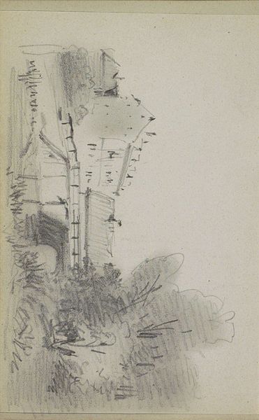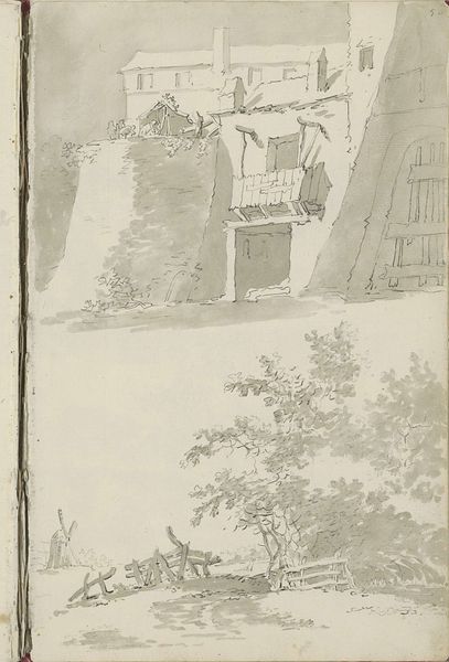 Curator: Let's consider this compelling drawing by Barend Hendrik Thier, dating from around 1780 to 1800, titled "Gebouw met torens en boerenhutten," or "Building with Towers and Farmhouses." It's rendered in pencil, depicting, as the title suggests, precisely that juxtaposition. What's your initial reading? Editor: Well, initially I’m struck by the duality. The top half, with its imposing tower, suggests authority and permanence. Down below, the farmhouse evokes something more humble, a simpler existence rooted in the land. Curator: Precisely. Consider how the artist employs a delicate, almost tentative, line. It's Neoclassical in its reserve, its emphasis on contour rather than volume, notice especially the sparse hatching. He really breaks the compositions on the page into the classical architectural shapes to which it hearkens back. Editor: Yes, there's a sense of yearning. The tower, as an architectural form, reaches for something beyond the material world, while the thatched roof and visible timber frame of the hut speak directly to practical necessities. Those darks on the lower half create weight that grounds the drawing, counterbalancing the lofty airiness of the structure above. It almost looks like Thier did it to portray a feeling of yearning and hope. Curator: That's a perceptive point. And consider how that contrast could represent social stratification of the time, perhaps a longing for idealized country life as opposed to grand, impersonal architecture and governance. This pencil sketch isn't just documenting buildings, but staging relationships. Editor: So the architecture carries this historical and class symbolism. Perhaps this placement and treatment underscores the complicated tension of country versus city that permeates so much art and literature. What lingers with you the most after observing this particular drawing? Curator: For me, it is the way he harnesses architectural structures to evoke the social atmosphere during that time. Editor: Yes, for me, it’s the powerful juxtaposition of high and low, aspiration and groundedness captured within the visual simplicity, and its lasting resonance to modernity.