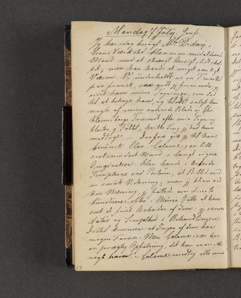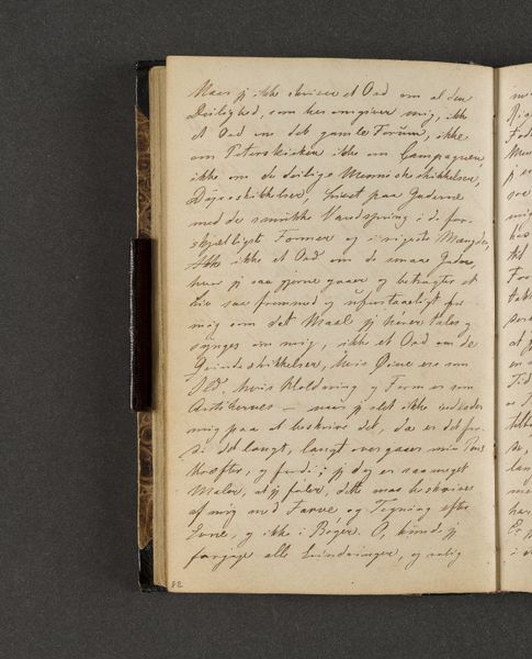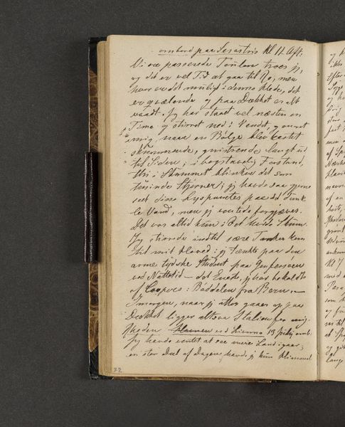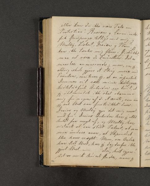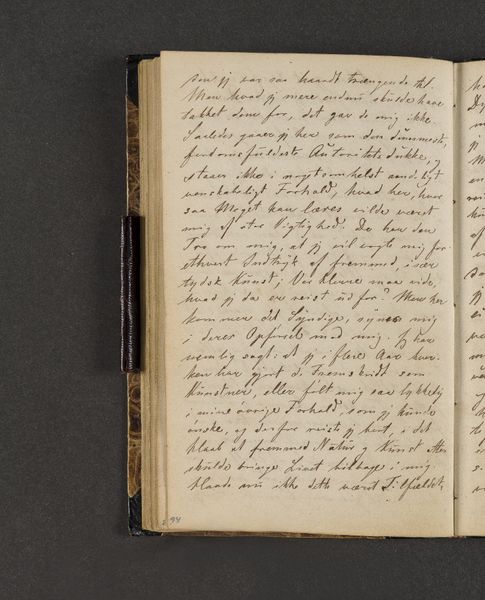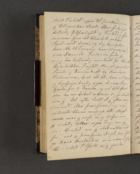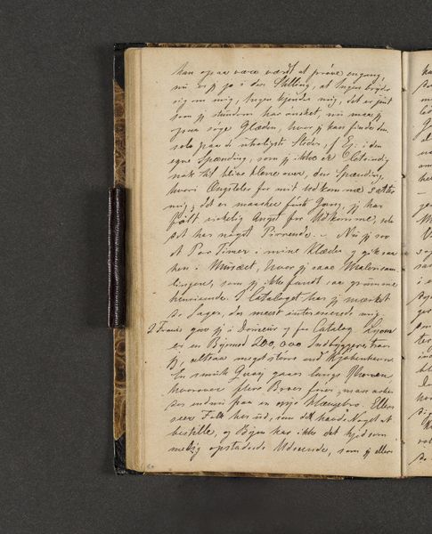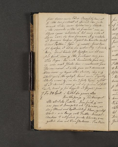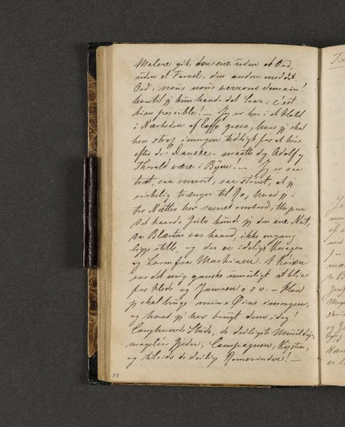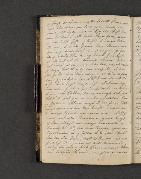 Johan Thomas Lundbye created this travel journal using paper, ink, and leather, sometime in the 1800s. The book’s covers are bound in what appears to be reptile skin, embossed with a repeated diamond pattern. The leaves within are filled with the artist's handwriting in a dark, consistent ink, indicative of the use of a quill or early fountain pen. The material qualities of the journal—its size, weight, and the texture of its pages—suggest intimacy and portability. It reflects the pace of travel and the practice of handwritten notation, which were key aspects of nineteenth-century life. These journals were precious objects, made by highly skilled tradespeople in book binding. By considering the materials and the embodied labor, we can gain insight into the culture of travel and documentation of the period. The journal stands as a testament to the enduring importance of craftsmanship and material culture in understanding the past.