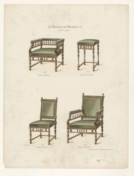 Here we see a lithograph titled "Drie stoelen," or "Three Chairs," produced by an anonymous artist in 19th-century France. The print showcases chairs from "Le Magasin de Meubles," a furniture store in Paris. These chairs, intended for a salle, or room, are more than mere objects; they are expressions of social status. The designs, with their varying degrees of ornamentation, speak to the era's fascination with historical styles and its burgeoning consumer culture. The rise of furniture stores and illustrated catalogs democratized access to design, but also codified social distinctions through taste. To understand this print, we might explore archives of French design, trade publications, and social histories of consumption. Art historians reveal the complex interplay between aesthetics, commerce, and social identity. Through this we can contextualize and interpret the cultural values embedded in everyday objects.