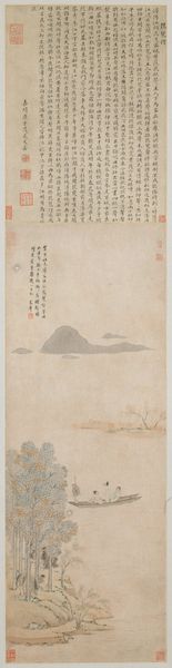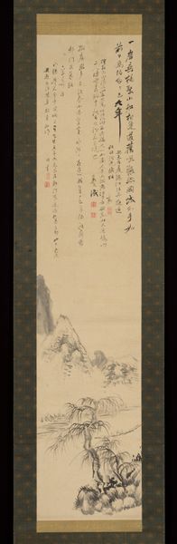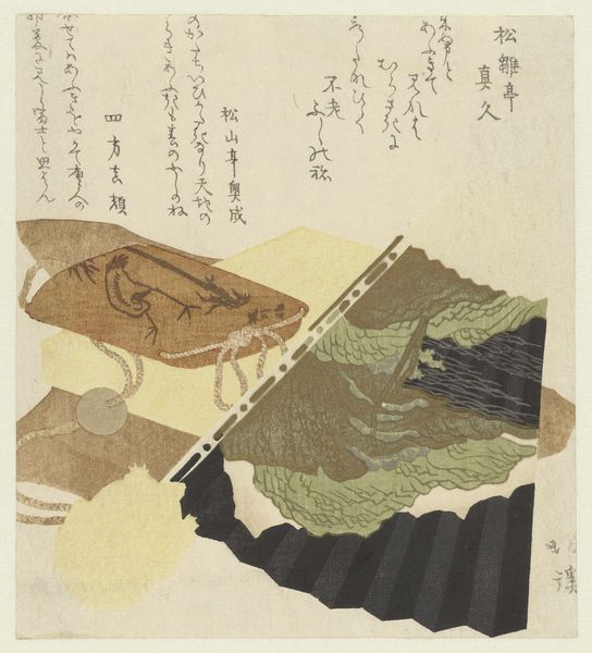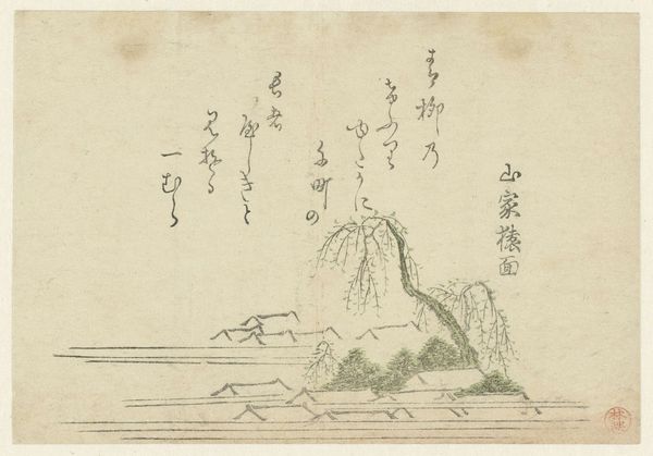 Curator: This work is titled "Setting Moon on Waves," created in the 19th century by Kubo Shunman. It's a woodblock print, very much within the ukiyo-e tradition. Currently, it resides here with us at The Met. Editor: Immediately, I am struck by the dynamic yet tranquil mood it conveys, paradoxically achieved through contrasting the jagged lines of the shoreline against the softly setting moon. What grabs you first? Curator: The way it captures the intersection of natural beauty with social commentary typical of ukiyo-e. It seems Shunman’s choices here create a unique viewing lens into the floating world through commentary about human relation to nature, especially in times of rapid societal transformation. Editor: Note the masterful use of line – observe the carefully incised marks that create the illusion of wave movement, balanced by the smooth gradation of color used for the moon, a testament to Shunman's technique, inviting philosophical exploration into the dualities of the world. Curator: And, how this composition subtly challenges social hierarchies. Think of the way traditionally dominant landscape art centered the powerful and elite. Here we find instead common access, focusing on the transient beauty experienced by anyone on a beach or a shoreline, democratizing beauty. Editor: Let's not forget the poetry inscribed on the work—a critical element. What interpretive layer does this text add when coupled with the visual elements, especially since the two work as a unit and a unified experience for the viewer. Curator: Precisely! The inclusion of poetry allows Shunman to connect not just to place, but personal reflection, enriching the social and political contexts of his art making—emphasizing the complex interrelationships within this single piece. Editor: Yes, by visually deconstructing its composition, appreciating its texture, the color, the way that moon rests there in a stable gradient balance over the restless wave action… we unlock new realms for semiotic, philosophical contemplation. Curator: I'm continually inspired to see art as not only about history, but about where it places us in critical conversations about societal issues, and its legacy for us today, long after the artwork first made an impression on its original audience. Editor: And for me, by decoding the intricate visual structure of works such as these we develop tools to navigate the human experience of aesthetics across centuries, so we will be ready to receive fresh impressions when approaching works by artists now working.
