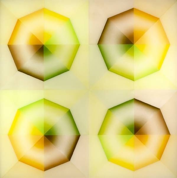 Curator: Judy Chicago's "Pasadena Lifesavers Yellow Series #2," created in 1970, features four meticulously rendered, concentric circles of color. Editor: The first thing that strikes me is the almost hypnotic effect of those soft, blurred color transitions within the hard-edged geometry. The muted palette is surprisingly soothing. Curator: Knowing this was executed in acrylic, during a time when the material was becoming increasingly available for artists, illuminates the intention to experiment with both color and the very idea of high and low art. She initially took up spray-painting cars for aesthetic and professional reasons, and acquired unique techniques that she employed within her artmaking, challenging traditionally masculine vocations by taking up the tools of industrial production. Editor: I'm struck by the subtle play of light and shadow within each circle. It almost feels like these forms are hovering just above the surface of the canvas. It’s a compelling push and pull between flatness and depth. Curator: Indeed. And it’s crucial to note Chicago's place within the Pattern and Decoration movement. This series highlights the devaluation of 'feminized' crafts while aiming to reintroduce decorative principles into a fine arts context, challenging a tradition of gendered and classed hierarchies. The execution mirrors industrial production, subtly underscoring the systematic omission and marginalization of art done by women. Editor: Absolutely. Looking closely, one notices that no two color combinations are quite alike. Each ring seems to operate as an independent study of chromatic interaction. What appear at first to be perfect geometric forms are, on further consideration, each uniquely individuated, despite being four parts of a series. Curator: I see Chicago's series as emblematic of that late 60’s and early 70’s interrogation of value within creative labor. What’s craft, what's art, who makes it, and how does that inform our perception? Editor: It’s true, it complicates that perceived art world purity in many interesting and important ways. Curator: Seeing the legacy, I am again reminded to ask these same questions regarding material culture that challenge established boundaries. Editor: This deep dive has heightened my appreciation for how line, color, and light intersect to evoke emotion.