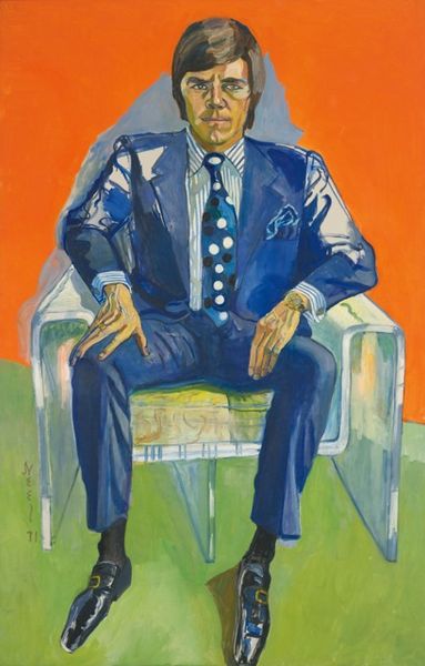 Curator: Clarence Holbrook Carter’s "William Stolte, Ex-Councilman," created in 1932 with oil paint, offers a stark glimpse into civic life during the interwar years. Editor: There's an incredible stillness, almost a sense of suspension about this painting. The palette, subdued except for the shine on the shoes, enhances the feeling of a world put on pause. Curator: Indeed. It speaks volumes about the power dynamics within local governance and reflects the realities of that era. It acknowledges that every figure, even the Ex-Councilman, exists in this structure of meaning and expectation. What does the imagery signify in this cultural tableau? Editor: Well, visually, notice the starkness of the corner where he’s placed. Corners often symbolize being trapped or caught. Then you see his hands, carefully posed. To me they’re the key, representing restraint, possibly reflecting his former position’s restrictions or a longing for something that used to be. And that carefully chosen tie. A reminder of position, power, respectability. Curator: That symbolism is fascinating! When we examine his positioning within the canvas, we start unpacking ideas of political agency and societal roles during a difficult financial period, no less. He represents both privilege and perhaps the loss of it; an examination of how class and status become entangled within the human narrative. How does that stillness impact the larger narrative? Editor: It allows us to ponder themes like the ephemeral nature of power, how symbols of status linger even after the status is gone. Curator: By setting it against that socioeconomic backdrop, Stolte’s personal narrative, made of symbolism and circumstance, reflects bigger truths about American society. Editor: I agree. Seeing him there, framed against the light corner, one senses that the artist has asked us not only to remember the man but the system which elevates some only to demote them later. It echoes even today. Curator: It leaves you to ponder not just Stolte himself, but the broader social structures that framed his world. A very poignant, politically rich composition by Carter. Editor: Exactly. It's about seeing beyond the man, delving into the story woven through time, position, and human nature. A worthwhile reflection, indeed.