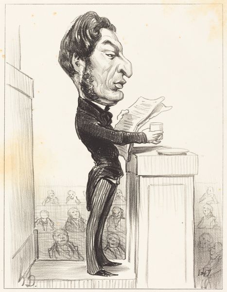 Honoré Daumier created this caricature of H.M. Augustin Corne, a French politician, using lithography. Daumier lived through a period of significant political upheaval in France, including the rise and fall of various regimes. Daumier was known for his satirical depictions of French society, and often faced censorship and persecution for his political views. The exaggerated features and gestures are meant to mock and critique Corne's character and political actions. There is Corne, seemingly frozen in action as he stands at a washstand, proffering a glass of water. Daumier's caricatures invite us to consider the relationship between physical appearance and moral character. The artist used his art as a form of resistance against corruption and injustice. He invites us to reflect on the role of art in shaping public opinion and holding power accountable. The act of sharing water seems innocent, but is loaded with questions about transparency and integrity.