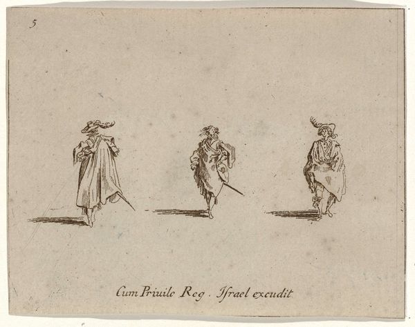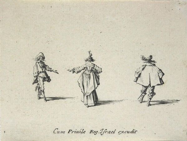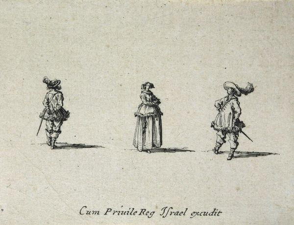 Editor: Here we have Jacques Callot's "Woman with Three Feathers in Her Hat, Seen in Profile Between Two Men". It's a small print, and the figures look so delicate. What strikes you about its composition? Curator: Note how Callot employs line—a veritable choreography of strokes. The hatching defines form, yes, but more importantly, it creates a dynamic visual rhythm. See how the figures are carefully placed, activating the negative space. Editor: So, it's less about *who* they are, and more about *how* they're depicted? Curator: Precisely. The subject becomes secondary to the formal arrangement. It’s the relationship between line, form, and space that speaks. Editor: I see. The empty space feels just as important as the figures themselves. Curator: Indeed. Callot masterfully demonstrates how formal elements can create visual interest, irrespective of narrative content. Editor: Fascinating; I’ll certainly look at prints differently from now on.