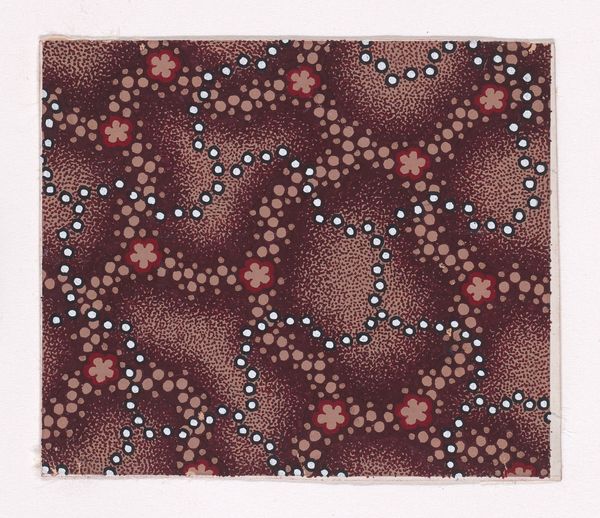 Curator: Let's take a look at this intriguing textile design from 1840, currently held here at the Metropolitan Museum. The piece, attributed to an anonymous designer, features a tiled background of alternating rectangular shapes, all framed by ribbons adorned with what appear to be pearls. Editor: Immediately striking! I’m seeing a complex interplay of geometric shapes. There’s something about that deep burgundy color that feels almost opulent, though in a strangely subdued way. I’m also noticing the meticulous detail, which gives the whole piece a very precise, almost mathematical feel. Curator: Absolutely. Consider the processes involved in creating such a design in the 1840s. Each line, each pearl, each textural element of those shapes required considerable handwork, suggesting a significant investment of time and skill from the artisan responsible. Were they working for a specific textile mill or as a freelance designer providing patterns to various manufacturers? Editor: It's that anonymity that gets me thinking. Who was this person? What social class did they belong to? Were they even recognized for their work at the time? These patterns, while seemingly decorative, are deeply embedded in the history of labor, of gendered expectations, of economic disparity. We need to explore who was able to consume these textiles, too, not just who made them. What did it mean to possess and display something like this? Curator: Good points! I wonder about the materials they used as well, the dyes in particular. How readily available was this color, burgundy, in the 1840s, and where might its constituent parts have come from? We might want to cross reference any production records of manufacturers known to trade locally at that time. Editor: And speaking of display, thinking about how textiles like this participated in world building and communicating status is central. What narrative about power and control do these kinds of luxurious textile patterns create within the context of broader colonial structures? Were they mimicking older traditions, or attempting something totally new? Curator: Excellent. I believe that the intersections of materials, labor practices, and markets hold just as much cultural insight. Editor: Agreed! Thinking about design and function intersecting with social factors helps paint a broader and more insightful picture of its context. Curator: Precisely! A richer and nuanced consideration of how we perceive an artwork and its origins. Editor: A perspective accounting for history, for craft, for societal impacts... for art, even beyond the art!