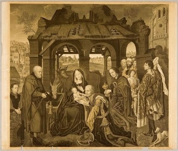 Curator: This is Ignaz Bergmann's "S. Norbert Preaching Against the Heretic Tankelin." Editor: The light and shadow are striking; it lends a somber, theatrical air to the scene. Curator: Indeed. Bergmann, active in the 19th century, captures a moment of religious and social conflict. Notice how the composition directs our attention to Norbert's gesture of authority against Tankelin. Editor: The use of chiaroscuro emphasizes the drama, highlighting the emotional tension between the figures. The setting is an interesting mix of geometric forms with classical ornamentation. Curator: The artwork reflects the socio-political tensions of the time, using religious narrative to convey power dynamics. Norbert's preaching, in essence, challenges established heretical views and the political structures they upheld. Editor: It’s quite compelling how the artist uses light and perspective to create a sense of depth and draw the viewer into this historical moment. Curator: It really does make us consider the artwork's broader historical context and the function of art as a tool for expressing ideas. Editor: It's a fascinating combination of form and context, offering insight into both artistic technique and socio-historical narratives.