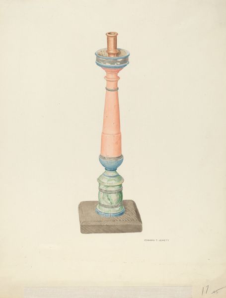 Curator: Editor: This is Majel G. Claflin’s “Holy Water Font,” made with watercolor and drawing between 1935 and 1942. It strikes me as very symmetrical and the line work, though simple, has a precision that is fascinating. What compositional elements stand out to you? Curator: Immediately, the interplay of geometric forms commands attention: the cylindrical shaft ascending from the tiered, almost pyramidal base. Observe how Claflin meticulously renders the subtle gradations of tone and hue to define each layer of the base, contrasting sharply with the comparatively smooth surface of the stem. How does the line quality enhance your appreciation? Editor: Well, the line work, especially around the top element, gives a sense of intricate detail, almost architectural in nature. It feels carefully planned, not spontaneous. Curator: Precisely. The artist’s attention to linear detail serves not only to delineate forms but also to create a sense of depth and volume. Consider, too, the economy of line in the depiction of light and shadow. Ask yourself, what relationship is being drawn, literally and figuratively, between form and function? Editor: It’s interesting how the different textures—the rough base, the smooth shaft, and then the more ornate top—create a visual hierarchy. I hadn't initially considered that. Thanks for highlighting the interplay of form and light. Curator: Indeed. Close attention to the intrinsic formal qualities often yields unexpected perspectives and interpretations. Hopefully this approach expands your aesthetic toolbox!