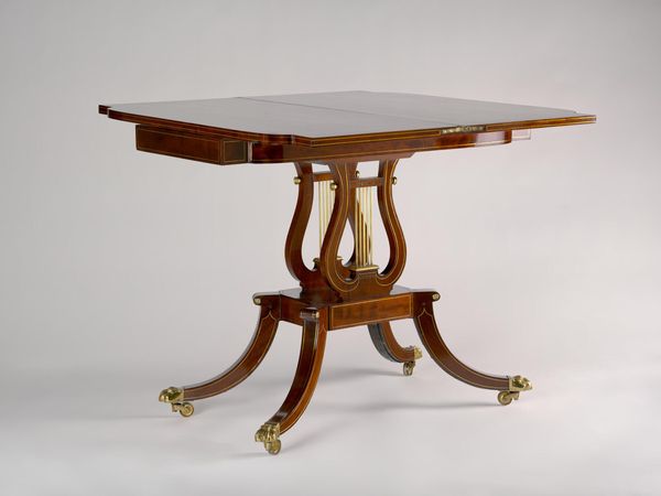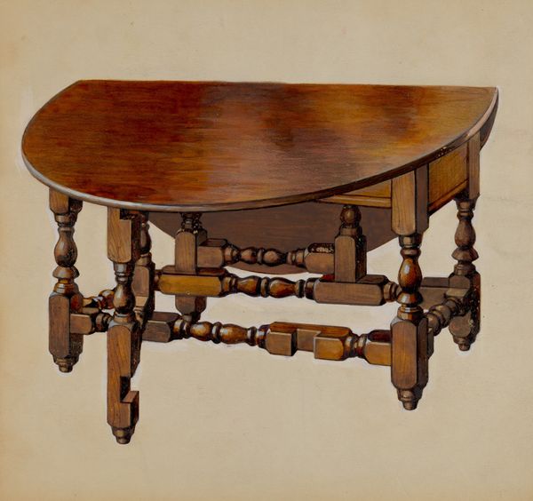 Curator: Look at this image. Amos C. Brinton captured "Gateleg Table" with a masterful use of watercolor back in 1939. Editor: It has a quiet dignity, doesn’t it? A very poised object, depicted with such meticulous care. You can almost feel the smooth polish of the wood and the patience that went into its making. Curator: It really evokes a sense of domesticity and a certain level of social positioning, wouldn't you say? This type of furniture reflects the values of the burgeoning middle class of that era, emphasizing stability and home ownership. The "Gateleg Table" stands not just as an object of utility but as a statement. Editor: The gateleg mechanism is inherently symbolic, representing the intersection of function and flexibility. When folded, it embodies restriction or hidden potential. Opened, it's expressive of expansive hospitality. There’s almost a ritual involved in extending its surface, isn’t there? Inviting communion or discourse. Curator: And we need to acknowledge how it engages with labor—the artist’s, the furniture maker's, the individual responsible for preserving this intimate setting of home and family in an era defined by stark social inequities, which many artists attempted to redress through either documentation or political confrontation. Editor: Absolutely. And look closer at the texture. The stippling effect he’s achieved really brings out the wood grain, hinting at age, endurance. These details contribute to a sense of familiarity. Perhaps they wanted the audience to feel connected, and to appreciate the value embedded in handcrafted, everyday objects. Curator: The table has been rendered so accurately that it is difficult not to imagine the gendered connotations connected to interior labor—a space primarily presided over by women in order to support societal structures dominated by male individuals. This is evident when compared to later works made by other artists engaged with these topics. Editor: Well, I’m left pondering what narratives have played out on its surface: family dinners, political discussions, late-night studies… What objects did it support, and what stories might it tell if only it could speak? It holds, in many ways, an entire realm of memories.