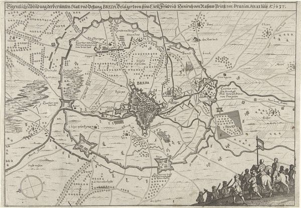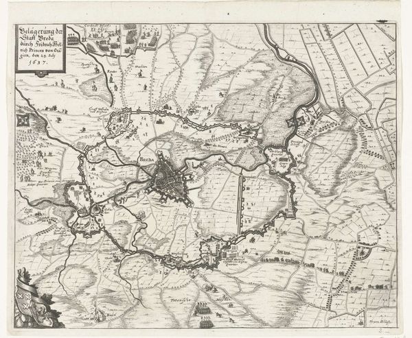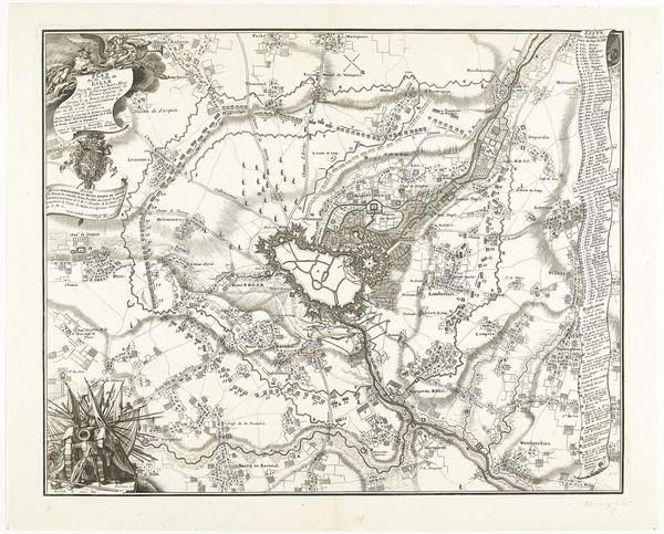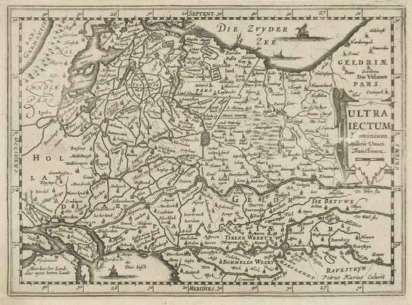 Editor: Here we have an anonymous print from between 1672 and 1699, titled "Kaart van de provincies Holland, Utrecht en Gelderland met de vestingen en forten gebouwd tijdens de oorlog in 1672." It seems to be a map rendered in ink and engraving. The detail is really striking. What elements of its composition stand out to you? Curator: I am struck by the work's elaborate deployment of line. Notice how the varied thickness articulates different spatial relationships. Thick, bold lines define provincial borders and major waterways, visually asserting their dominance within the pictorial field. What do you make of the texture created by the hatching? Editor: It does create depth, doesn't it? Almost a feeling of volume, particularly in the areas representing land. So the density of the hatching perhaps communicates the significance or value of certain territories? Curator: Precisely. The density contributes to a kind of visual weighting. Moreover, the topography, differentiated by subtle shifts in linework, indicates the tension between natural form and imposed order. Do you see how the calligraphic quality of the text merges with the landscape itself? Editor: Yes, the lettering, although informative, really blends with the overall image. So, even functional elements contribute to the aesthetic experience of the map as an artwork? Curator: Exactly. Consider too the decorative cartouche; its flourishes introduce an element of ornamental complexity that complicates a purely utilitarian reading of the map. It also provides visual interest and depth with shading achieved through various methods like cross-hatching, but that ornamentation is at tension with utility. Editor: That's fascinating, I never considered how elements like cartouches affect the entire structure of an image. Thank you for pointing it out. Curator: My pleasure. The artwork here illustrates how cartographic representation can move beyond mere geographical data to become a visually compelling art form.
