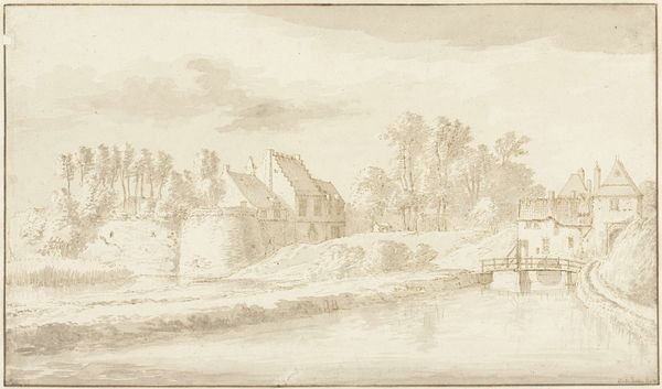 Cornelis Pronk created this drawing, "Het kasteel Batestein bij Vianen," with pen and gray ink, accentuating the architectural details of the castle against a serene landscape. Pronk masterfully uses line and light to guide our eyes. Note how the strong vertical lines of the sunbeams contrast with the horizontal stretch of the castle walls. This interplay creates a dynamic yet balanced composition. The texture is subtly varied, from the smooth expanses of the sky to the detailed rendering of the stonework, each contributing depth and realism. The semiotic use of light here is striking. The sunbeams act as directional signs, drawing our attention to key structural elements of the castle, underscoring its imposing presence within the landscape. This formal arrangement is not just aesthetic; it invites us to contemplate the themes of power and permanence embodied by the architecture itself. The drawing remains open to interpretation, its formal qualities encouraging a dialogue between the artwork, its historical context, and the viewer.