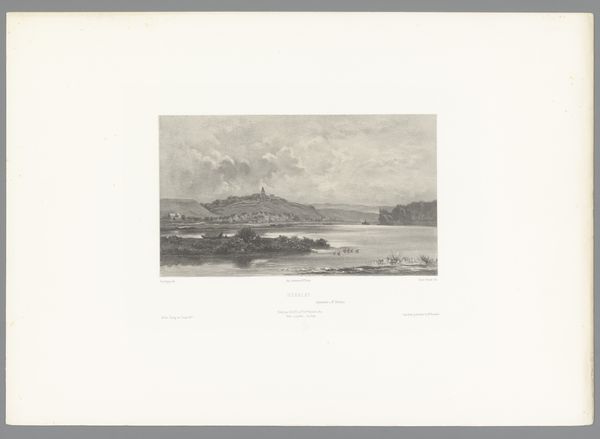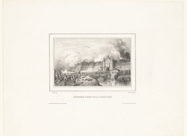 Editor: Here we have Victor Adam's "Oversteek van een rivier," or "Crossing of a River," created sometime between 1832 and 1835. It's currently held at the Rijksmuseum. It seems to depict a military scene, rendered in very fine detail. What is your impression of the image? Curator: My attention is drawn to the stark contrasts created through the delicate pencil work. Observe how Adam establishes depth using precise shading and controlled line work, specifically in how the eye is led from the dark foreground to the lighter, almost ethereal background. Note the meticulously rendered figures; can you discern how their arrangement affects the narrative? Editor: I see that, with the dark figures near the shore contrasted against those distant figures nearly disappearing in the smoky haze. It’s creating almost separate planes in the image, even within the same scene. Curator: Precisely. The light and shadow are not merely representational; they become compositional tools. Reflect upon the texture achieved by these simple materials – pencil and paper. Note also the controlled rendering of the landscape. How does the strategic distribution of tonal values affect your interpretation of the "crossing"? Editor: It makes it feel almost overwhelming – the sheer number of figures diminished by the wide landscape, the sky above. I also see how the 'fading type' hand-drawn letters beneath the image work almost as part of the atmospheric conditions portrayed in the work. Curator: Exactly. It invites a meditation on themes of scale, presence, and absence. Ultimately, Adam crafts a powerful visual statement by leveraging the inherent qualities of his medium. What is your feeling after studying this work more closely? Editor: The focus on formal qualities has given me a greater understanding of how a simple medium, carefully executed, can evoke complex ideas, thanks!