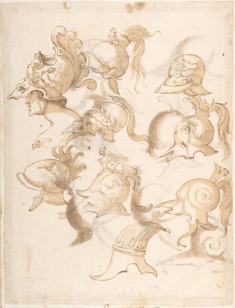 Editor: We're looking at "Studies of Two Helmets and of Two Soldiers Wearing Helmets," a Renaissance ink drawing by Marco Marchetti. The detail is striking! It's like a visual catalogue of extravagant headgear. What details stand out to you from a formal perspective? Curator: The artist demonstrates facility with line. Note how line variations create form, volume, and texture. The precise cross-hatching establishes value and shadow, providing depth despite the monochrome medium. Notice especially the upper-right helmet, almost grotesque in its elaboration. Consider the semiotics of adornment: How do these lines visually convey status and power? Editor: The grotesque element you mentioned makes me think these could be caricature drawings or costume studies. Curator: Potentially. But before reaching representational interpretations, scrutinize how the artist has arranged the four studies. They form a loose geometric pattern. Are you struck by the different line weights and textures? It appears some helmets were emphasized while others were mere sketches. It seems more of an exercise on light and shadow, less on realistic form. Editor: I see it now. It's more about the artist exploring technique than accurate representation. The tonal differences really bring that out! I guess I was too caught up in the subject matter to notice at first. Curator: Precisely. Form takes precedence. Reflect on the composition: Marchetti eschews balanced symmetry for asymmetrical arrangements that invite our eyes to dance across the sheet, constantly discovering the varying textural dynamics created via pen and ink. The negative space plays just as a strong of role! Editor: I appreciate the reminder to consider the relationship between form and content, focusing on how they interact, rather than leaping to a reading of what's depicted. Thanks for expanding my viewpoint! Curator: And I find your immediate reading of the subject most helpful; the symbology adds more value to the structural layout as well.